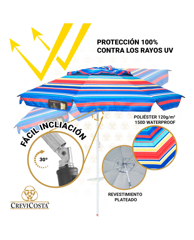 Todas estas características hacen que las nuestras sombrillas de las mejores del mercado. Y para que las personas puedan conservar mejor le damos un consejo de Limpieza: aplicar agua dulce (nunca salada ni agua de mar) con un trapo húmedo y jabón neutro. No usar productos abrasivos.