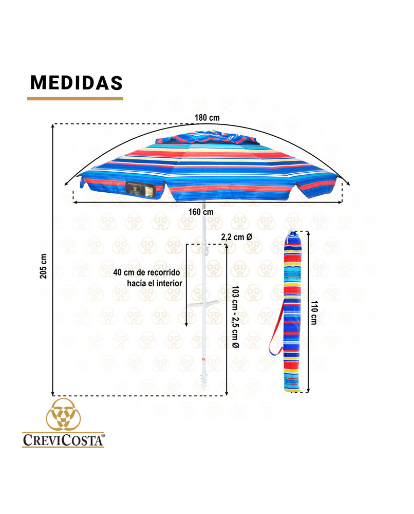 Sombrilla de tamaño medio. Cubre una superficie de 1,60 cm. Dispone de un mecanismo de inclinación que le permita un ajuste fácil para protegerse de la luz solar, dependiendo de la posición del sol. Su práctica funda con asas para transporte para que su viaje a la playa sea más cómodo y agradable. Medias de Las medidas exactas pueden comprobarlas en fotografía adjunta.
