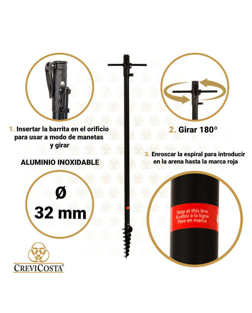 • Práctico, funcional y actualizado diseño del poste que permite ajustar a la altura que se desee. Nuestros parasoles cuentan con sistema patentado de espiral para insertar en la arena de forma rápida, fácil y segura.