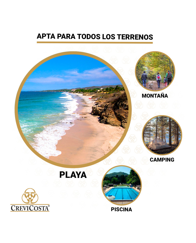 • Tejido poliéster 145g/m2 300D WATERPROOF, con recubrimiento de plata y tratamiento para soportar el sol, que aporta un tacto y aspecto elegantes a nuestros productos. PROTECCIÓN TOTAL especial UPF100+ contra los rayos UV, garantizando una protección completa frente a los rayos solares.