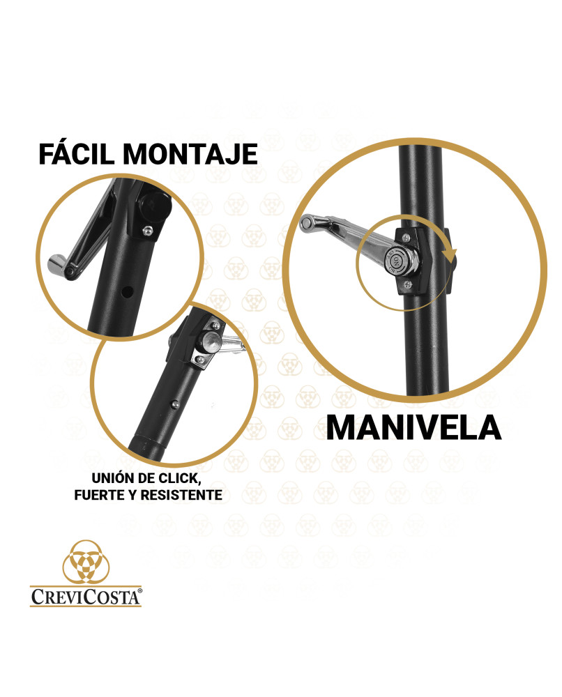 Se caracteriza por su sistema de apertura con manivela, permitiendo una fácil apertura y cierre del parasol.