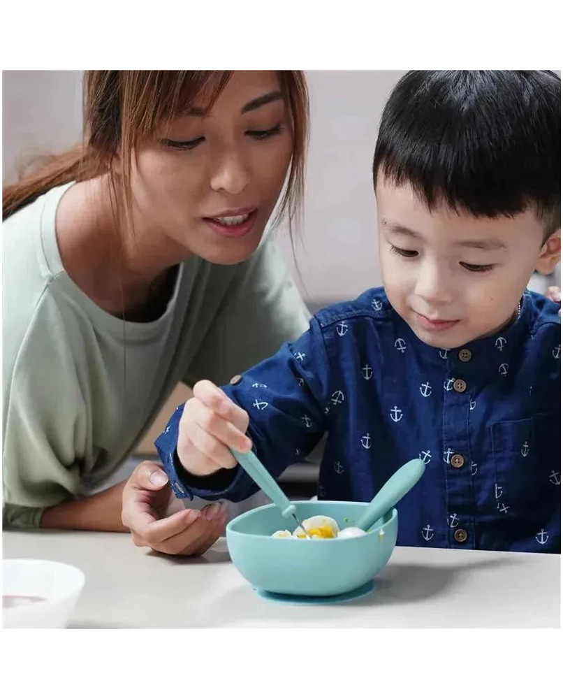 El Juego de Cubiertos Infantiles para Niños de 3 Piezas es un juego de cubiertos para la tercera etapa que incluye un tenedor, una cuchara y un cuchillo de acero inoxidable. El juego de iniciación perfecto para los más pequeños que están en la transición a los cubiertos para adultos, ha sido diseñado específicamente con mangos gruesos de tamaño perfecto para el agarre de su pequeño. Su diseño único en forma de arco los levanta de la mesa, lo que ayuda a mantenerlos libres de gérmenes. Con esquinas y bordes redondeados que los hacen seguros para los niños, este juego está hecho de acero inoxidable de alta calidad y tiene una forma ergonómica para ayudar a las manos de los pequeños a desarrollar su motricidad fina mientras comen con los adultos en la mesa. ¿Buscas accesorios a juego? Este juego está envuelto en una hermosa paleta de colores pastel que combina con el resto de la gama de vajillas y bebidas de . Para niños que aprenden a comer solos Juego de cubiertos de 3 piezas para la tercera etapa: tenedor, cuchara y cuchillo A partir de los 12 meses Adaptado al agarre de los más pequeños Mango diseñado para levantar el utensilio de la mesa y evitar ensuciar Forma arqueada que ayuda a prevenir la contaminación Acero inoxidable Hermosa paleta de colores pastel Ligero y fácil de limpiar Bordes redondeados para una alimentación segura Apto para lavavajillas Libre de BPA, plomo y ftalatos