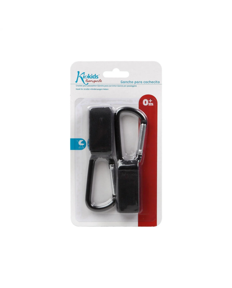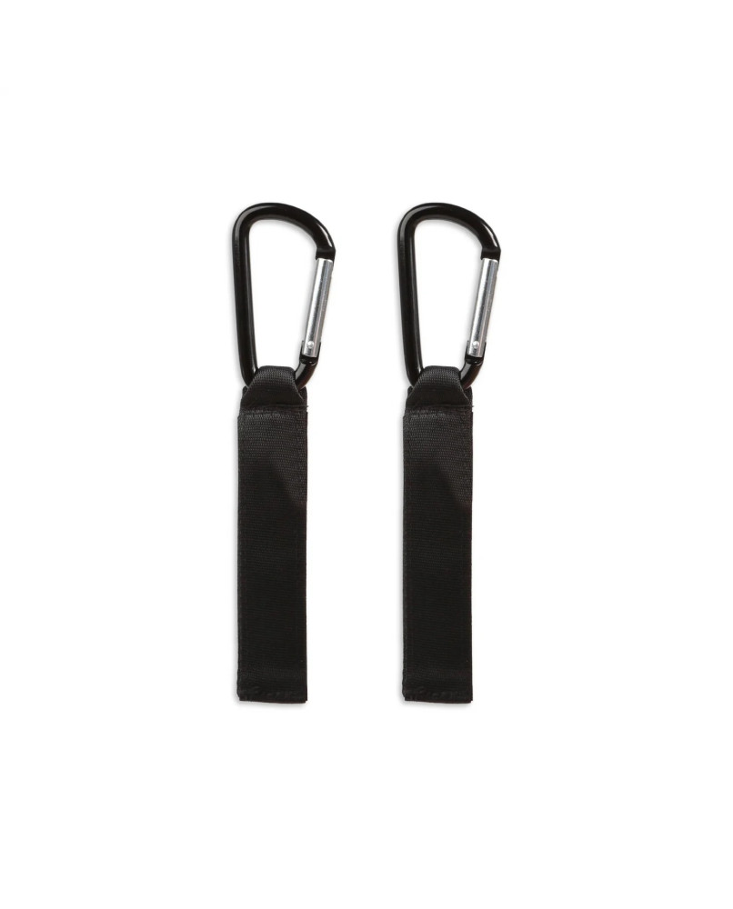 Set de dos mosquetones de tamaño pequeñomedio que se fijan a cualquier manillar de cochecito o silleta mediante velcro y permiten colgar distintos objetos o bolsas fuera del bolso de maternidad. Más seguros que otros ganchitos que no llevan cierre completo, como estos