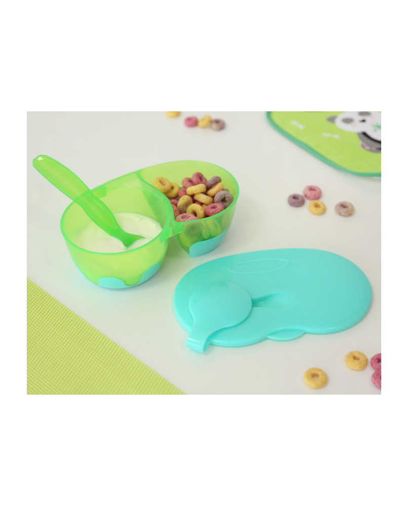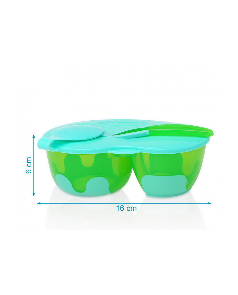 Descripción Si tu peque quiere comer en el parque o en la playa, lleva siempre contigo este práctico cuenco doble. siempre es útil llevar uno con la comida en dos compartimentos separados y con su tapa hermética. nuestros cuencos tienen gran capacidad, ¡y muchas ventajas!. incluyen una tapa para poder transportar la comida, así como una cuchara que podremos almacenar en ella. cuenta con una base antideslizante y dos departamentos independientes para almacenar la comida. está recomendado para niños de +4 meses. · antes de usarlo por primera vez lave el artículo con agua tibia y jabón suave. · apto para lavavajillas (solo en la bandeja superior). · no apto para esterilizadores. · no hervir. no calentar en el microondas. · no utilizar productos abrasivos o disolventes. · no exponer directamente a la luz solar. Edad Recomendada: +4 meses Color: Azul