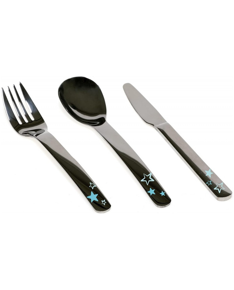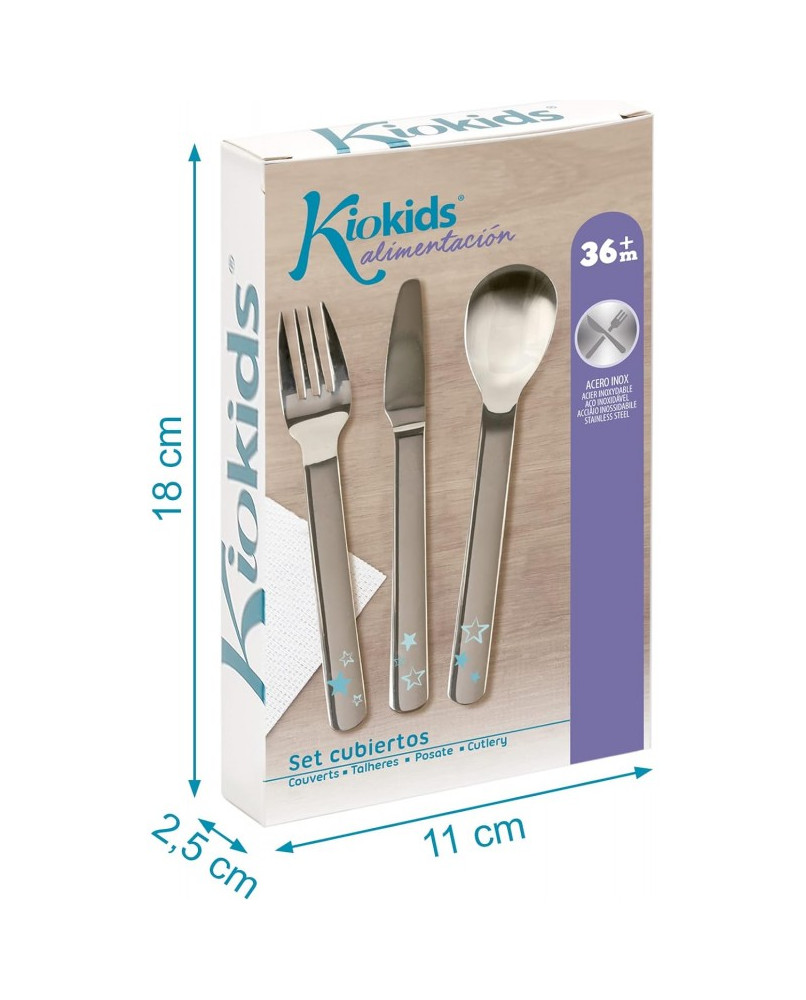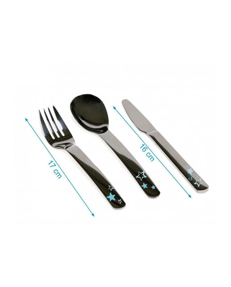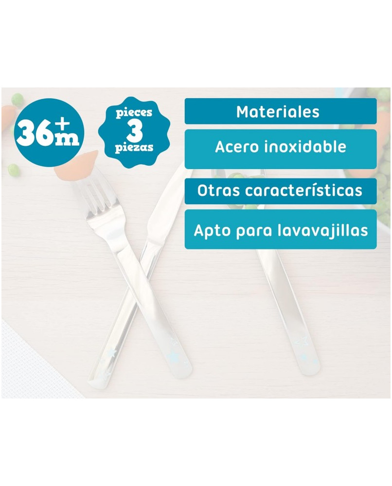 Este set de tres cubiertos infantiles en acero inoxidable (cuchara, tenedor y cuchillo) está pensado para los niños un poquito más mayores que ya se han habituado a utilizar algún otro tipo de cubierto de iniciación, y queremos que den el siguiente paso habituándose al uso de cubiertos lo más parecidos posible a los de los adultos. Ideal también cuando preferimos eliminar los plásticos en contacto con los alimentos. Está recomendado para niños de +36 meses. · Antes de usarlo por primera vez lave el artículo con agua tibia y jabón suave. · Apto para lavavajillas (solo en la bandeja superior). · No apto para esterilizadores. · No hervir. No calentar en el microondas. · No utilizar productos abrasivos o disolventes. · No exponer directamente a la luz solar. Material: acero inoxidable. Advertencia: Utilizar siempre bajo la supervisión de un adulto.