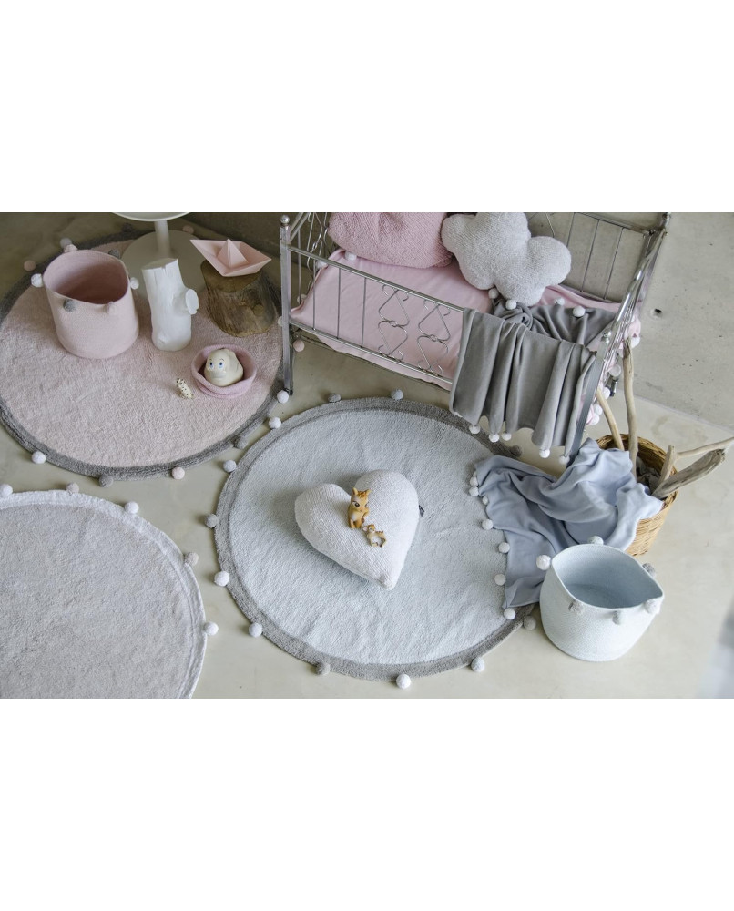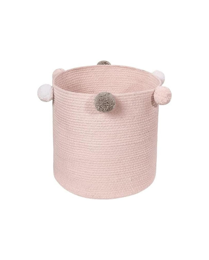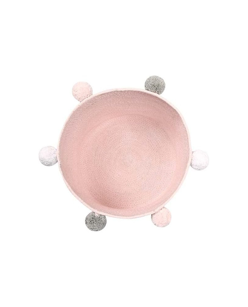 Cesta de algodón trenzada con base circular, en color rosa y bolas de algodón en color blanco, gris y rosa en la parte superior de la cesta. Hecho a mano: Cada pieza se realiza a mano de forma artesanal una a una. Lo que hace que cada producto sea único. Ecofriendly: 100% Algodón Natural con tintes no tóxicos lo que hace un producto seguro para niños y adultos. Ligero gracias a composición suave y flexible Fácil de combinar: Puedes combinarlo con otros elementos y así conseguir un ambiente cálido y acogedor.