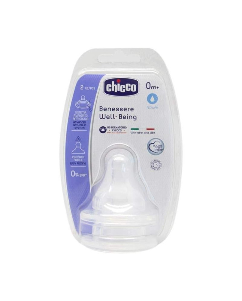 Tetina fisiológica WellBeing con silicona “efecto mamá” 0M+ FLUJO REGULAR. 2 piezas por unidad. Tetina Fisiológica con Efecto anticólicos testado* La válvula anticolícos está diseñada para prevenir la ingesta de aire, ayudando a reducir la irritabilidad, el reflujo y los cólicos posteriores a la ingesta. * Test de consumidores realizado con 200 bebés y madres en Italia. 2015 Alimentación tranquila e ininterrumpida 1. La base amplia y redonda facilita la succión. 2. Las lineas estriadas favorecen una sensación natural. Suave y elástica: Tetina suave y elástica para pasar del pecho al biberón y viceversa de una forma fácil. Silicona "Efecto Mamá": Su exclusivo acabado proporciona a la tetina una textura extremadamente agradable durante la succión. Probado por los bebés y aconsejado por las mamás.* * Test de consumidores realizado con 200 bebés y madres en Italia. 2015 Tetina fisiológica intercambiable: Las tetinas son compatibles con todos los biberones WellBeing y están disponibles en diferentes niveles de flujo. Con materiales seguros y libre de BPA.