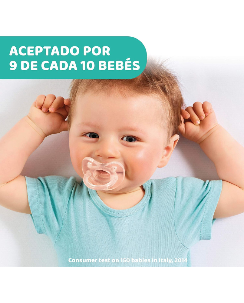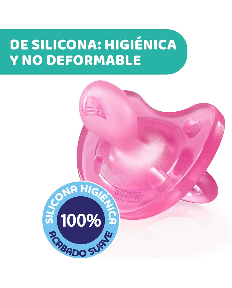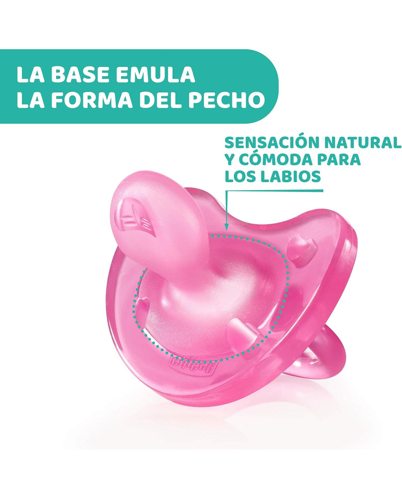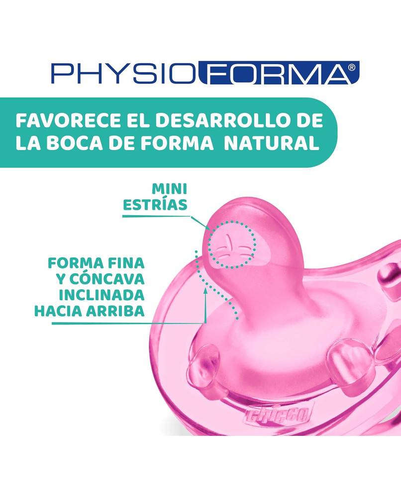TECNOLOGÍA PHYSIOFORMA: la innovadora tetina de los chupetes se adapta a las funciones fisiológicas de la lengua, favorece activamente el correcto desarrollo de la boca y facilita la respiración del bebé. DE UNA SOLA PIEZA: los chupetes Physio Soft de están formados de una sola pieza de silicona, sin escudo rígido, que proporciona un acabado suave y delicado con la piel del bebé y también se pueden usar a la hora de dormir porque no deja marcas del escudo en la cara del niño. BASE REDONDA: la base suave y redondeada de la tetina del chupete permite que los labios se cierren de forma natural; la forma es similar a la del pecho materno y estimula la succión del bebé. TETINA DE SILICONA: la tetina del chupete Physio Soft está realizada 100% en silicona suave, elástica, resistente e higiénica, que asegura una sensación de comodidad durante la succión. AGUJEROS DE VENTILACIÓN: los agujeros de ventilación de estos chupetes permiten el paso del aire y reducen el estancamiento de la saliva, que normalmente causa irritación en la piel del bebé.