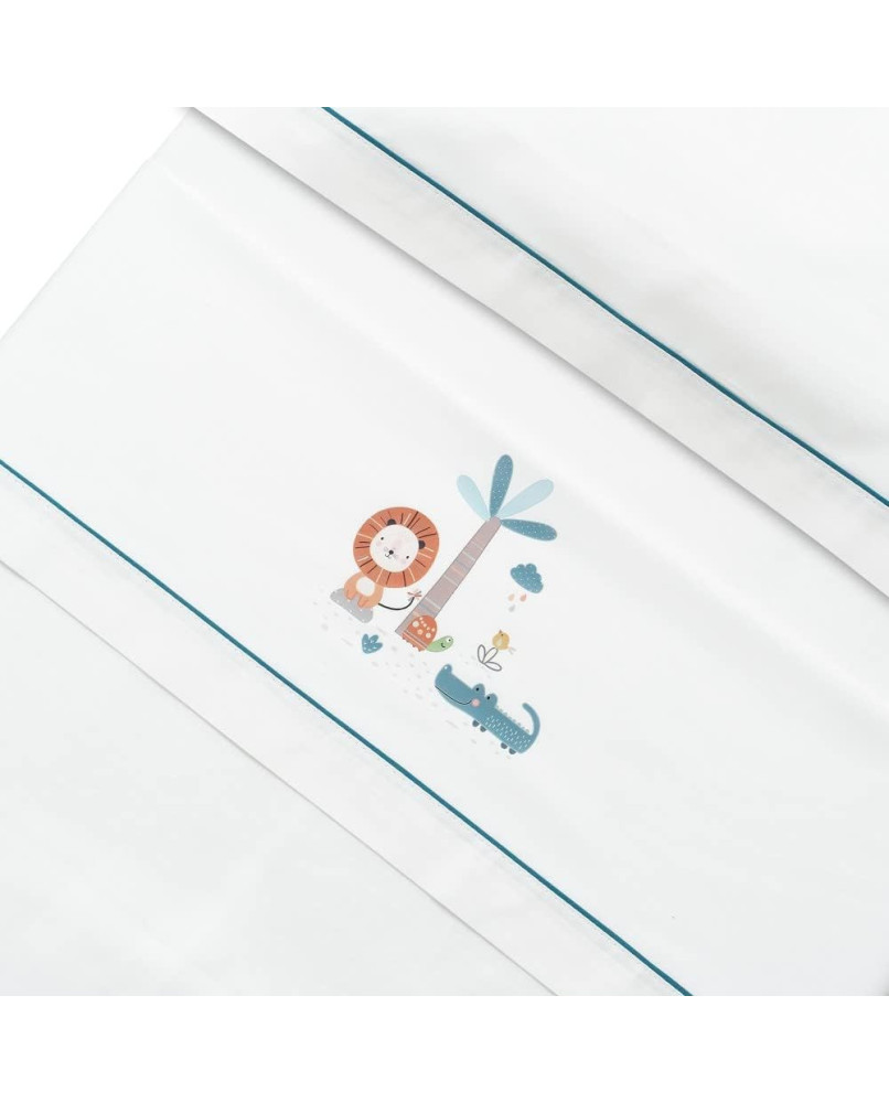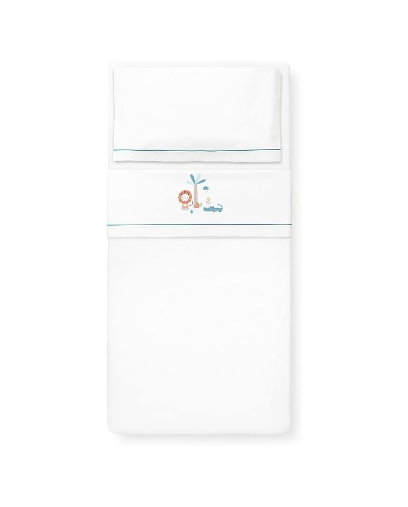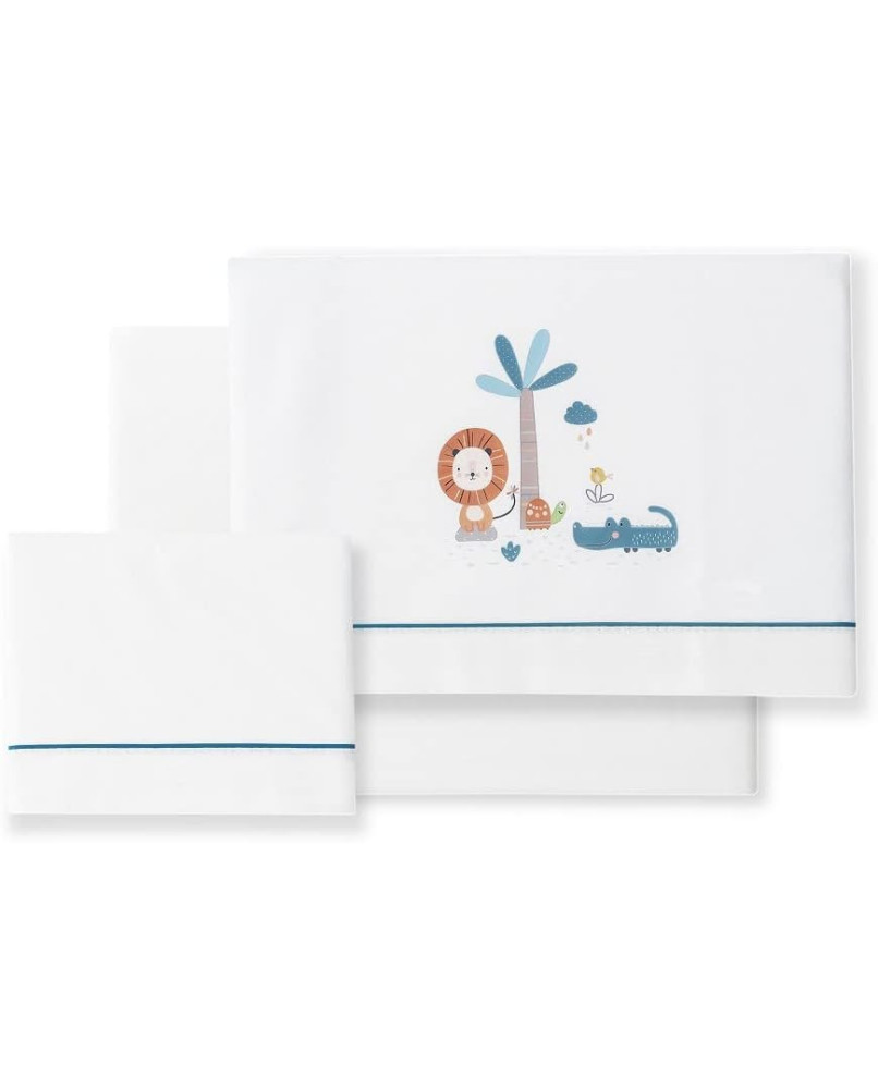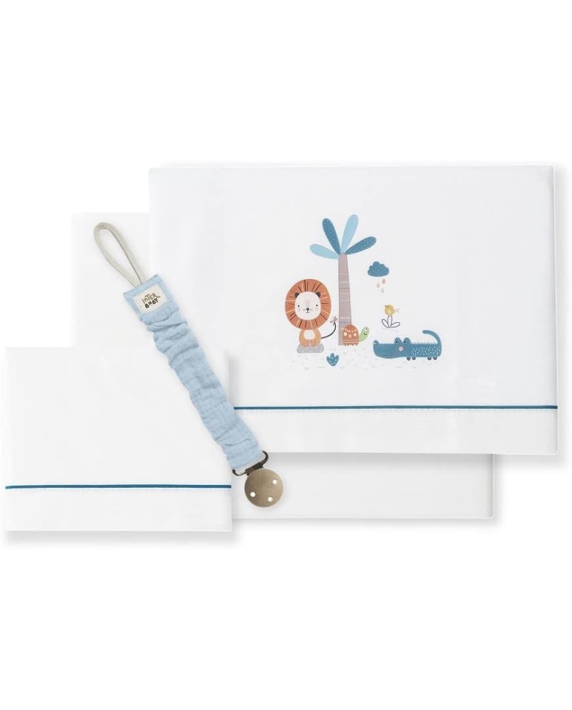 El juego de sábanas, está fabricado 100% en algodón para que el descanso de tu bebé sea más confortable. Son sábanas fresquitas que transpiran mejor en los meses de primavera y verano, lo que hace que el bebé esté a gusto y relajado en su cuna. Las sábanas de cuna se presentan en una caja decorativa con el frontal transparente para que puedas ver con detalle el bordado del juego de sábanas. Incluyen una sábana bajera ajustable para que quede bien sujeta al colchón de la cuna, una funda de almohada y una sábana encimera con un bonito bordado. El juego de sábanas es compatible con todas las cunas del mercado, sus medidas son: 60x120 cm. Recomendamos que entre el colchón y la sábana bajera se use un protector de colchón. El juego de sábanas incluye un chupetero de muselina.