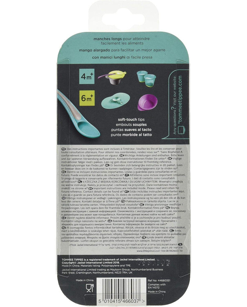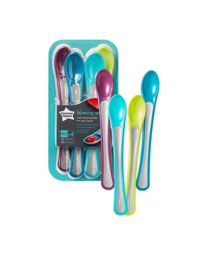 Características de las cucharas: - Colores: morado, azul, verde y turquesa - Mango largo para llegar hasta el ultimo rincón de los envases - Sin BPA - Apto para lavavajillas, microondas y esterilizador - Recomendado desde los 4 meses Pack de 4 cucharas de colores de la marca Tommee Tippee. Con ellas podrás dar de comer a tu pequeño sus primeros alimentos sólidos sin la preocupación del daño que pueda hacer el cubierto, gracias a su fabricación en silicona que le confiere un tacto suave.