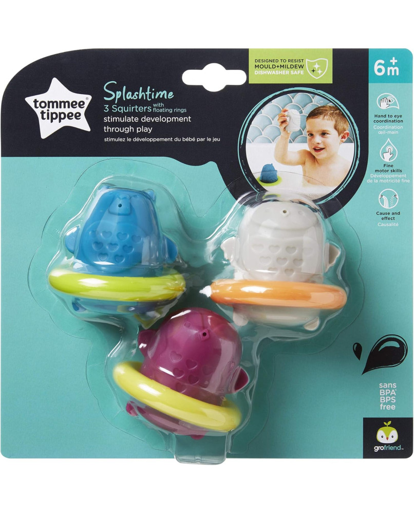 Deja que chapotee en el baño con nuestra gama Splashtime. Los juguetes de baño hacen que la hora del baño sea más divertida para todos, y ayudan a los niños a aprender importantes habilidades jugando en el agua. Disfruta de la hora del baño y prepárate para mojarte con estos graciosos juguetes lanza agua flotantes. Aprieta los adorables muñequitos y verás cómo el agua sale disparada. O déjalos flotar suavemente sobre las olas y las mareas de tu bañera. Flotan, se aprietan y lanzan agua: Aprieta las tripitas de estos juguetes y verás cómo el agua sale disparada, o déjalos flotar sobre las olas de tu bañera Promueven el desarrollo: Ayudan a tu bebé a desarrollar la coordinación manoojo, la motricidad fina y la relación entre causa y efecto jugando en el agua Fáciles de lavar: Aptos para lavavajillas Diseño resistente al moho: Para mantener tu baño limpio y seguro para el bebé Pack de 3 – Cada pack incluye 3 juguetes de la colección Grofriend para máxima diversión acuática