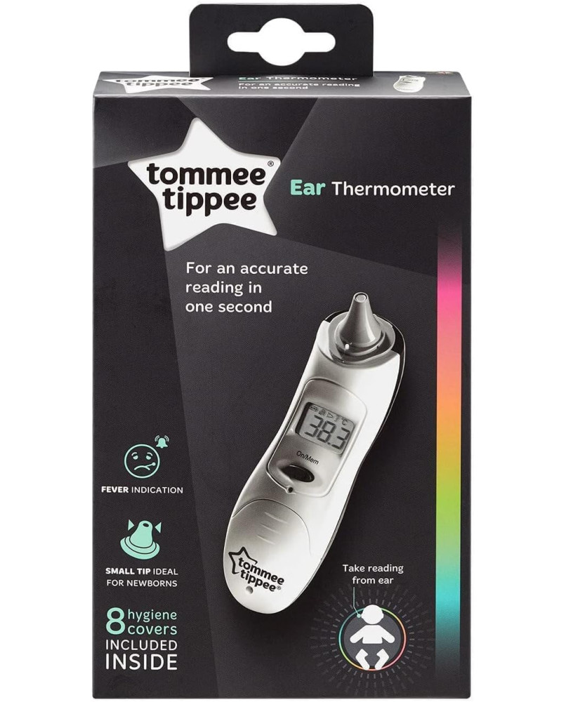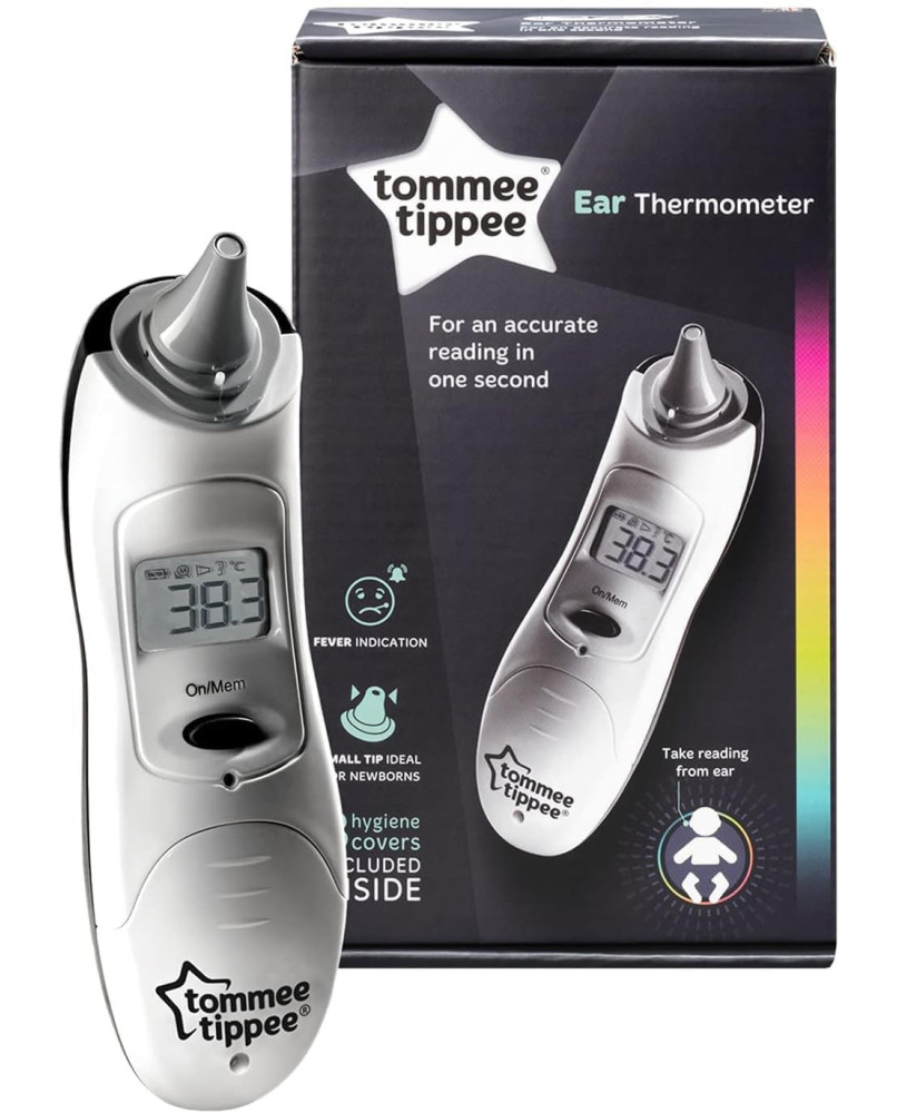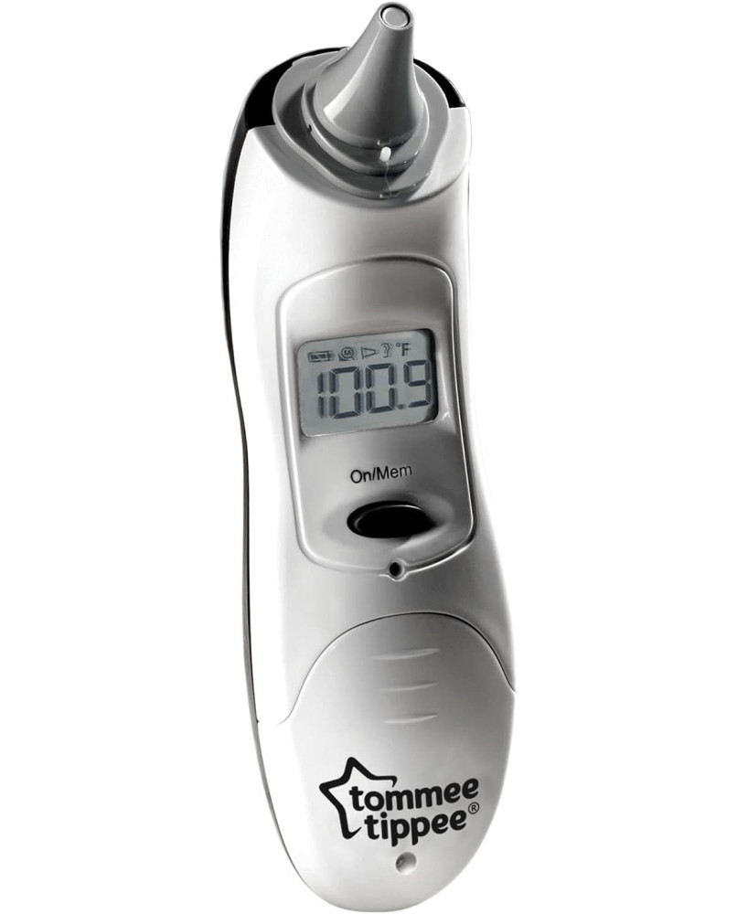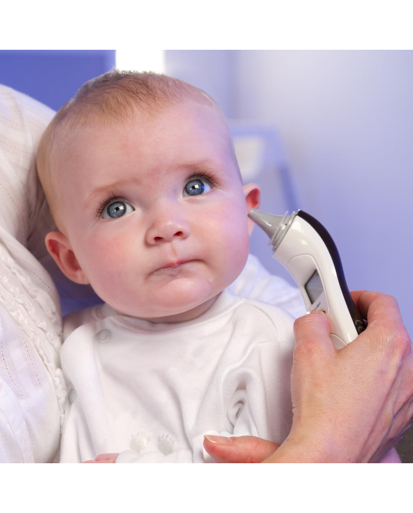 Nuestro termómetro digital para bebé es rápido, preciso y muy fácil de usar. solo tienes que colocar la pequeña punta en el oído del bebé y pulsar el botón de medir para que la lectura de la temperatura se muestre al cabo de 1 segundo en la amplia pantalla lcd. Su pequeña punta es ideal para recién nacidos y, a la vez, sirve para toda la familia Medición precisa en 1 segundo Alarma de alerta de fiebre cuando la temperatura es muy alta Pantalla lcd amplia y fácil de leer Guarda las 9 últimas lecturas en la memoria para poder controlar y comparar