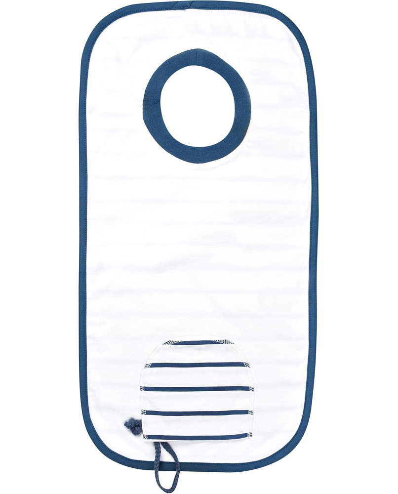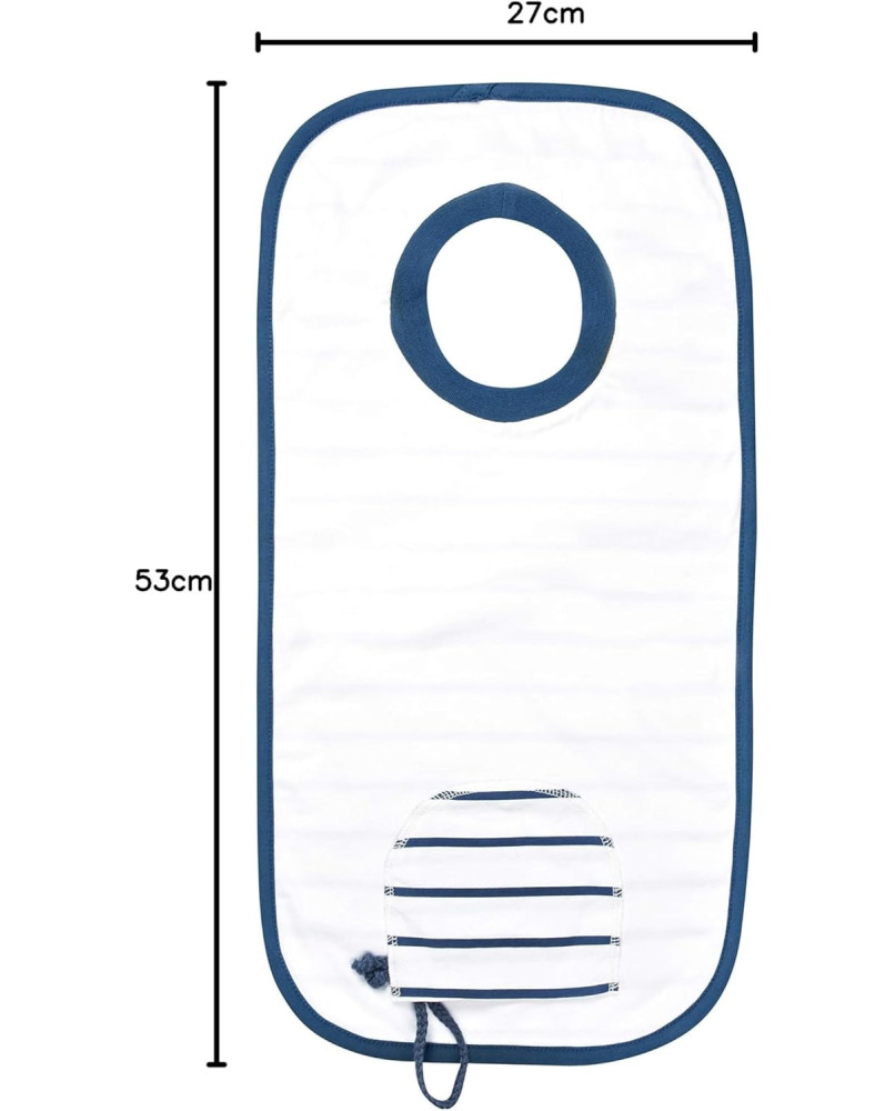 El babero de algodón es un babero largo y ancho que proporciona una mejor protección para tu hijo. Es fácil de poner y gracias a su cuello elástico de camiseta no hay riesgo de dañar el cuello de los niños. Adecuado para ser utilizado desde el nacimiento hasta la infancia. El babero de algodón se pliega en su bolsillo cosido para un transporte fácil y limpio. Cuidado: lavable a máquina a 30°. Disponible en varios diseños. TAMAÑO ÓPTIMO: Babero largo y ancho para disfrutar de una protección óptima, 53 x 27 cm PRÁCTICO: Fácil de poner y sin riesgos de lesiones gracias a su cuello teeshirt elástico EVOLUTIVO: Apto desde el nacimiento del Bebé hasta la infancia, óptimo para el comedor TRANSPORTABLE: Se pliega sobre sí mismo para ofrecer un transporte más fácil y limpio 100 % ALGODÓN: Babero certificado por OekoTex