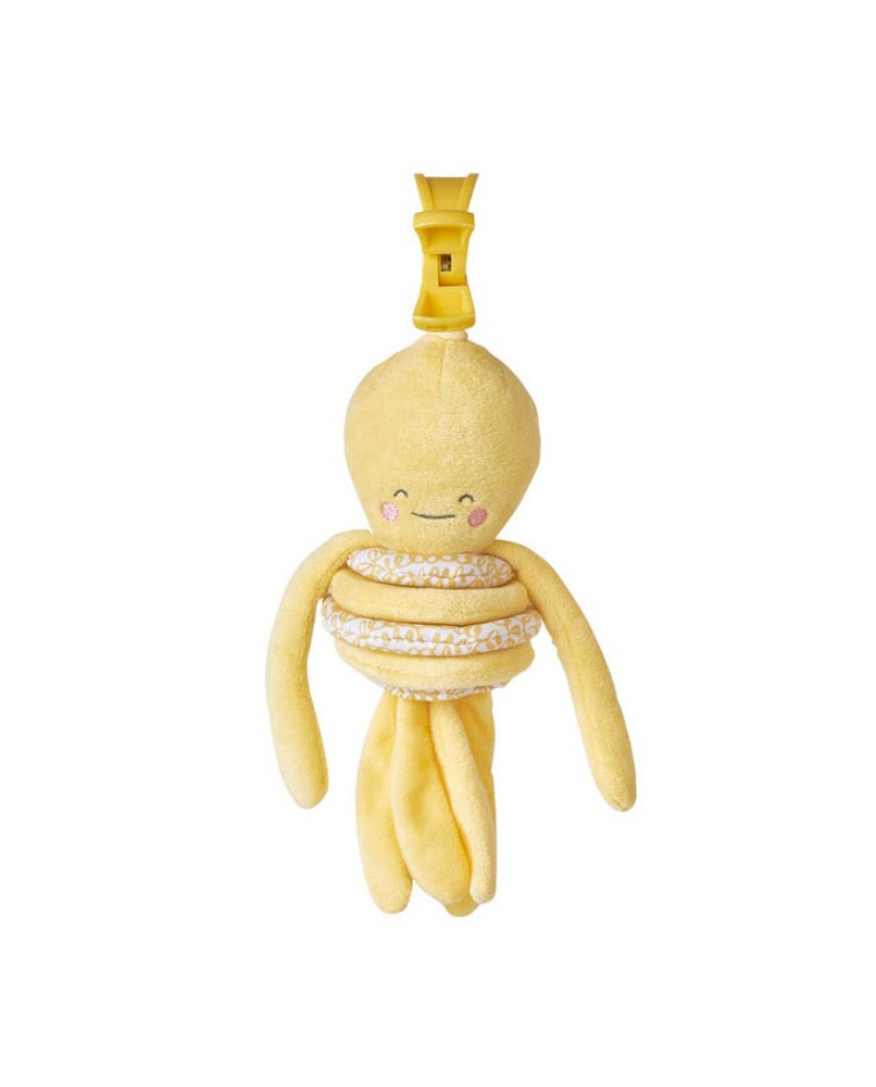 Los paseos más divertidos gracias a este suave animalito. Al tirar de sus patitas su cuerpo se extiende, volviendo a su posición a ritmo de temblón y cascabel. El bebé no parará de reír. El dulce sonido de su sonajero acompañará a tu bebé. Es perfecto para colocarlo en la capota del cochecito, o en la sillita del grupo 0, con un sencillo sistema de ajuste con pinza. Color. amarillo.