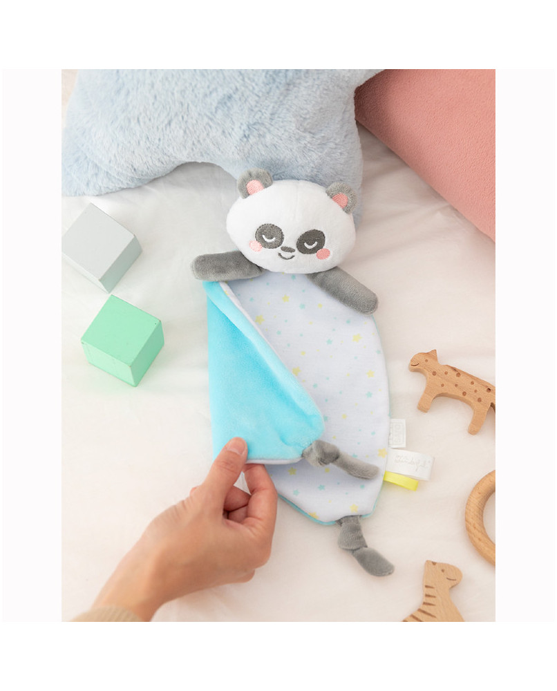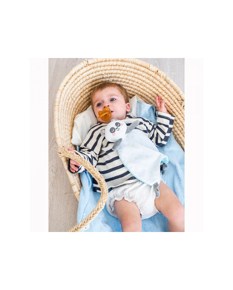 Doudou Panda 0m+: se convertirá en el mejor compañero de siesta y abrazos para tu bebé durante sus primeros meses. Gracias a sus patitas anudadas, cintas de satén y etiquetas, el bebé se divertirá mucho agarrándolas y mordiéndolas.