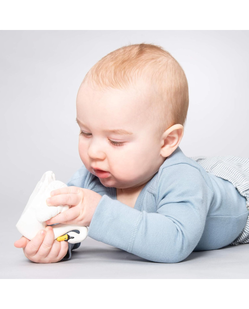 Imagínese esto: su bebé está balbuceando, y fuera de su ventana, una familia de cisnes pasea por el océano. Este es el comienzo de Natruba y cómo el ave nacional de Dinamarca, el cisne mudo, una criatura hermosa y elegante, ahora es un juguete impresionante para el juego sensorial, la masticación y el baño. Este elegante juguete está elaborado a mano en caucho natural procedente de silvicultura sostenible. Cuidadosamente esculpido y pintado a mano con colores seguros. Como todos los productos Natruba, este cisne es un juguete totalmente natural, ecológico, no tóxico (libre de PVC, BPA, ftalatos y nitrosaminas), diseñado sin válvula, lo que significa que no se pueden acumular moho ni bacterias en el interior. Texturas de ps Cuerpo lleno de aire Pico sólido Tacto de superficie similar a la seda Hecho a mano