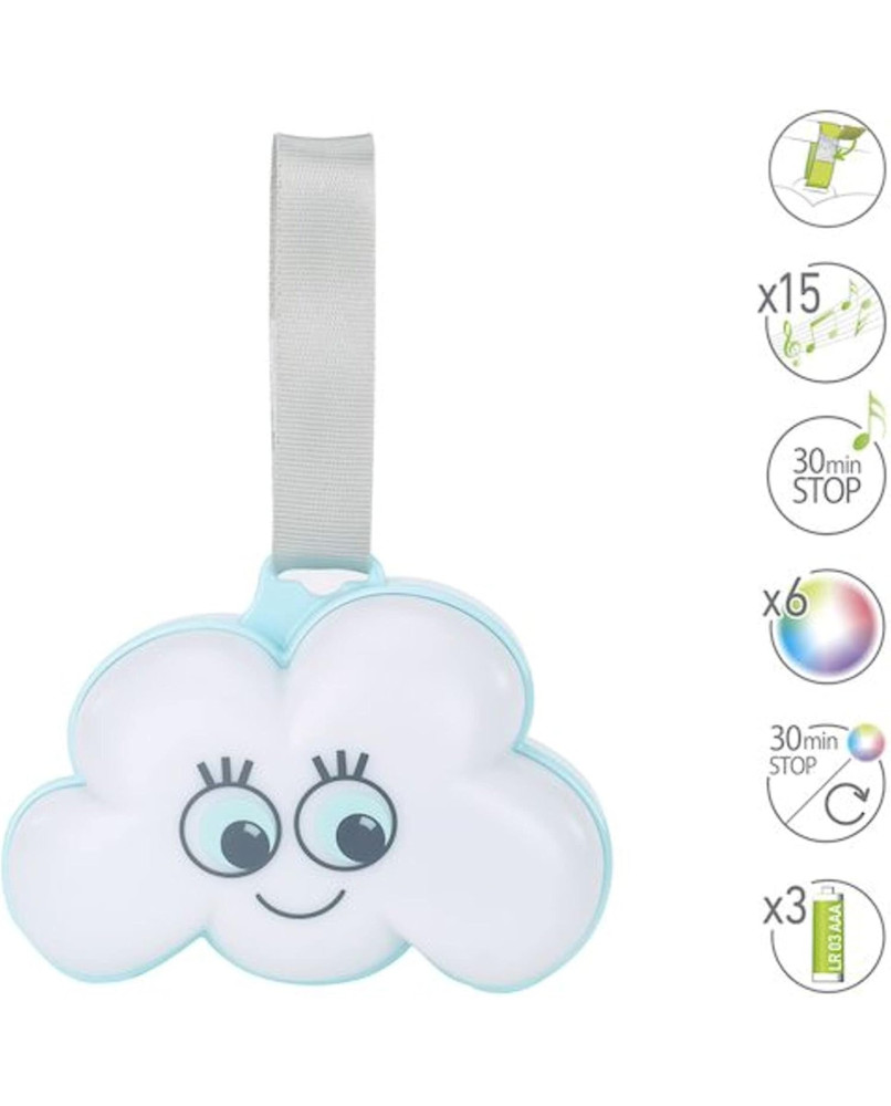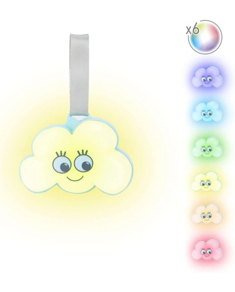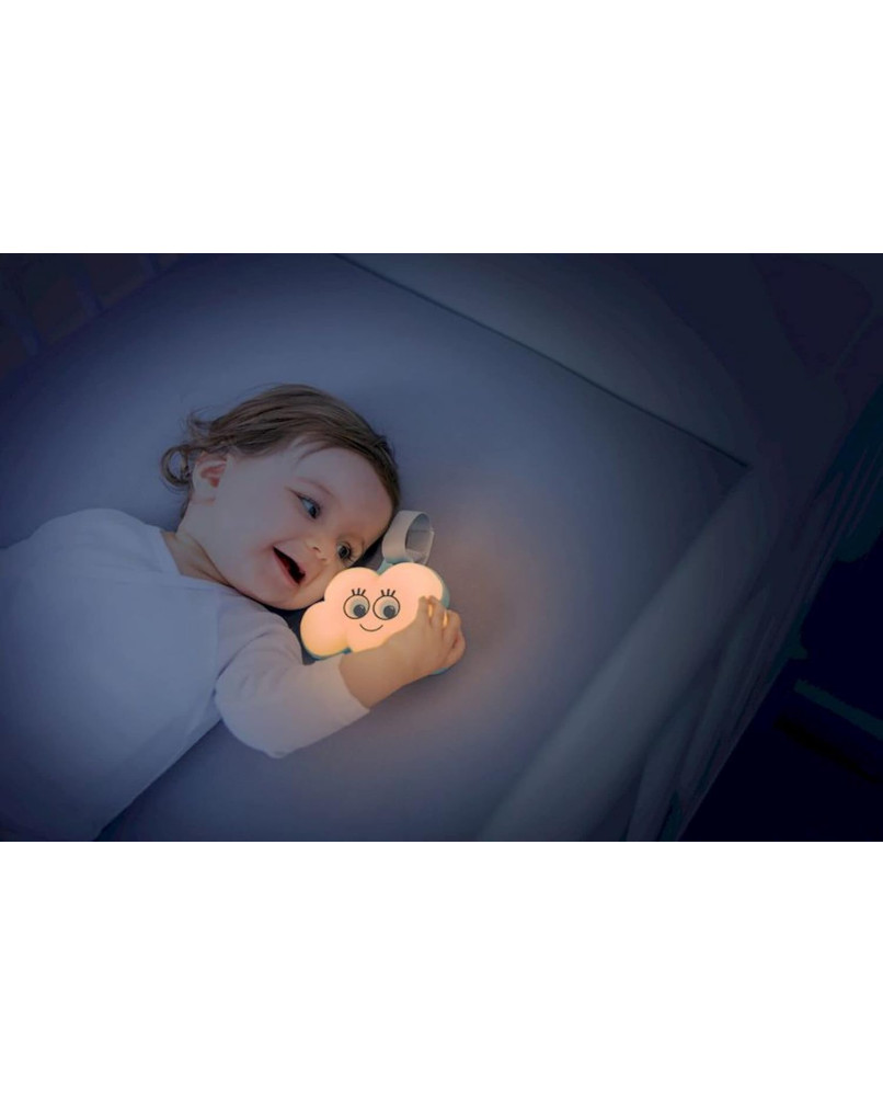 ¡La hermosa nube Night Light de se adapta a múltiples soportes! Se adhiere a todo tipo de soportes gracias a su accesorio de velcro. Completamente móvil, funciona con batería. La música que puede tocar permite que el bebé se duerma serenamente.