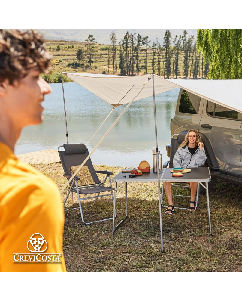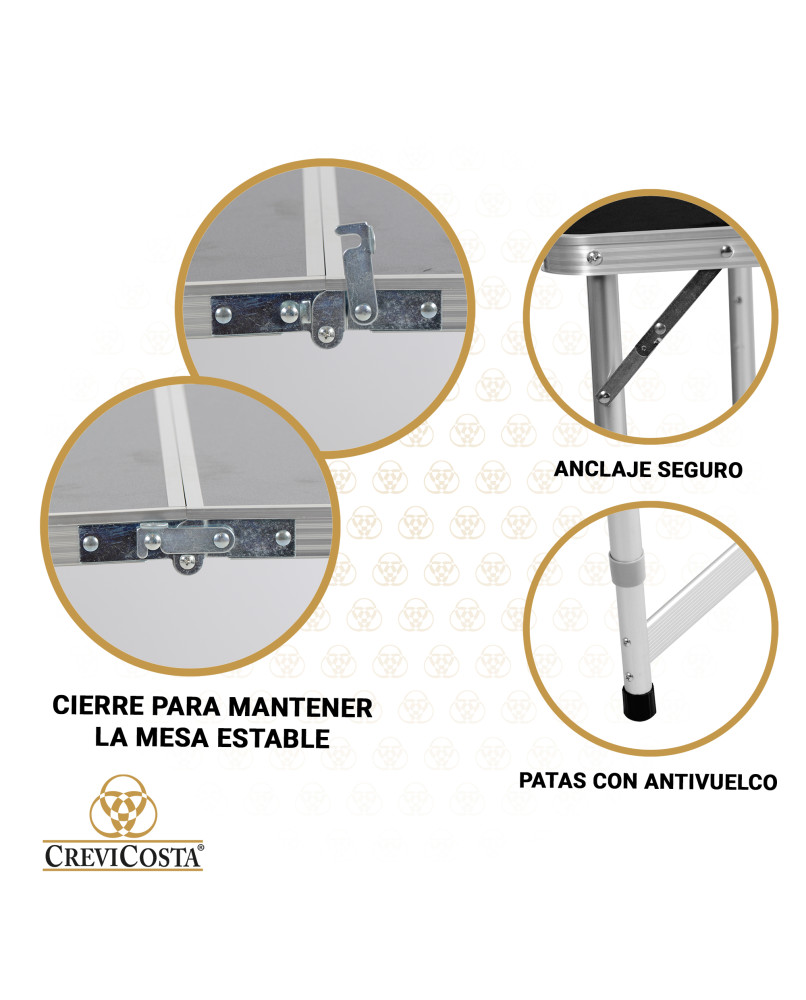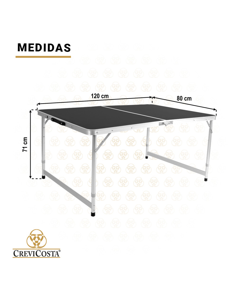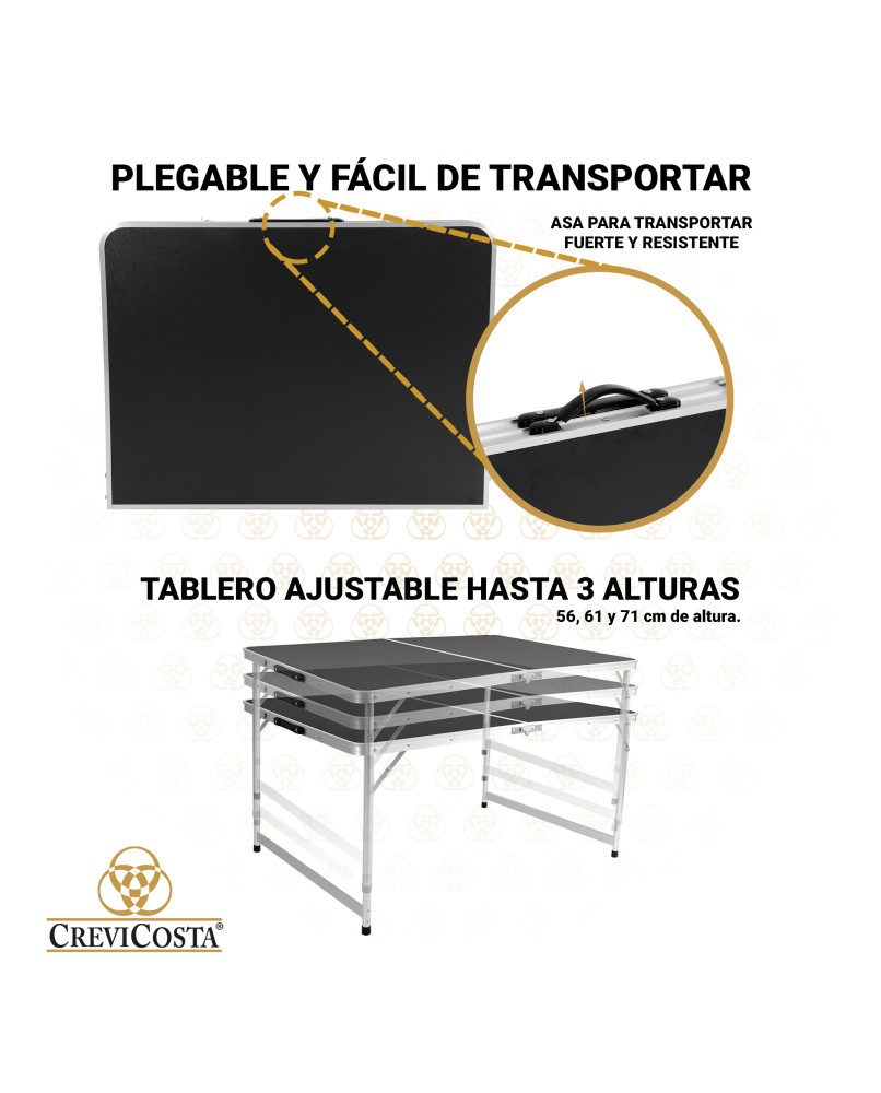 Mesa duradera y cómoda para todos los usos. Perfecta como mesa auxiliar en el jardín, camping, en la terraza, en el comedor, en ferias o eventos. Superficie de polietileno de alta densidad, duradera, fácil de limpiar e impermeable. Diseño plegable con sistema de transporte sencillo y seguro con asa integrada para un fácil transporte. Las patas de aluminio y el sistema de bloqueo garantizan la estabilidad y durabilidad. Se pliega en segundos y ocupa el mínimo espacio. Instrucciones de uso incluidas. Tablero ajustable a 3 alturas: 56, 61 y 71 cm de altura.