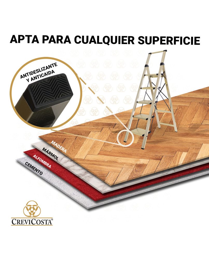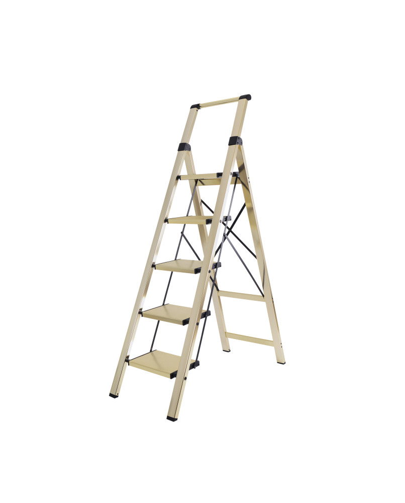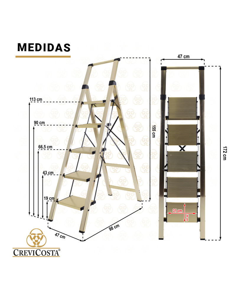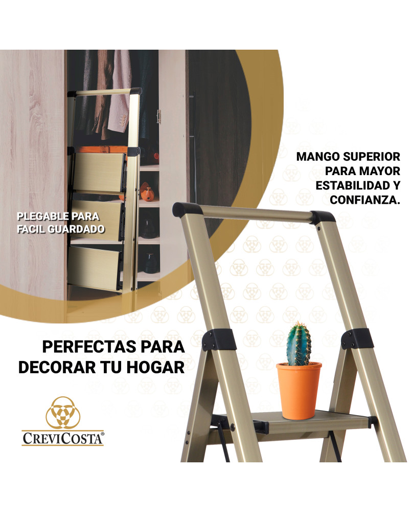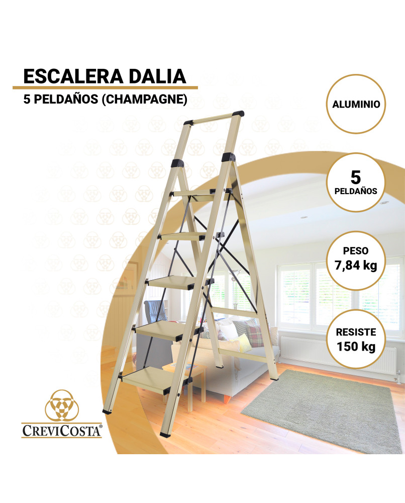 Escalera de Aluminio con Mango – 5 Peldaños Modelo Dalia (Champagne). Seguridad, estabilidad y diseño para tu hogarLa escalera de aluminio con mango Dalia de 5 peldaños es la solución perfecta para alcanzar esos lugares altos de forma segura y cómoda. Fabricada en aluminio resistente y ligero, combina funcionalidad con un diseño moderno en color Champagne, ideal para cualquier espacio del hogar. Tornillería y remaches de alta calidad. Cuenta con peldaños antideslizantes amplios y estables, y un mango superior ergonómico que proporciona un mejor agarre y equilibrio durante su uso. Compacta y plegable, se guarda fácilmente ocupando muy poco espacio. Características destacadas:5 peldaños anchos con superficie antideslizanteEstructura de aluminio ligera y duraderaMango superior para mayor seguridad y apoyoColor Champagne elegante y modernoPlegado compacto para fácil almacenamientoIdeal para tareas en el hogar, oficina o pequeños negociosPeso soportado: hasta 150 kg. Consejo de limpieza. Limpieza en seco. No utilizar productos abrasivos, de esta manera garantiza que no perderá el brillo inicial.