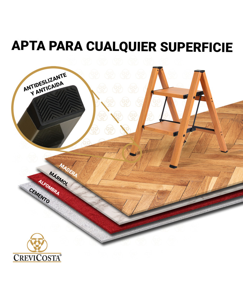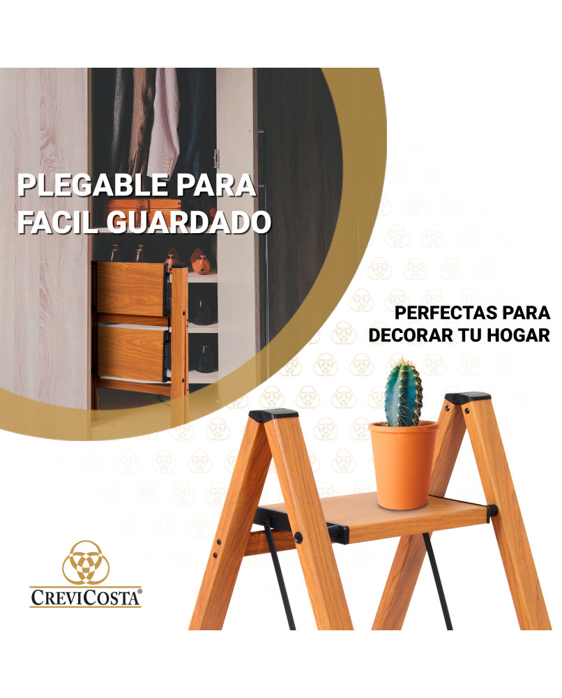 Cuenta con peldaños antideslizantes amplios y estables. Compacta y plegable, se guarda fácilmente ocupando muy poco espacio.