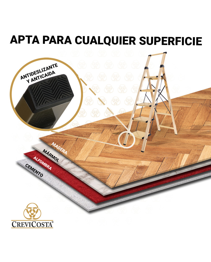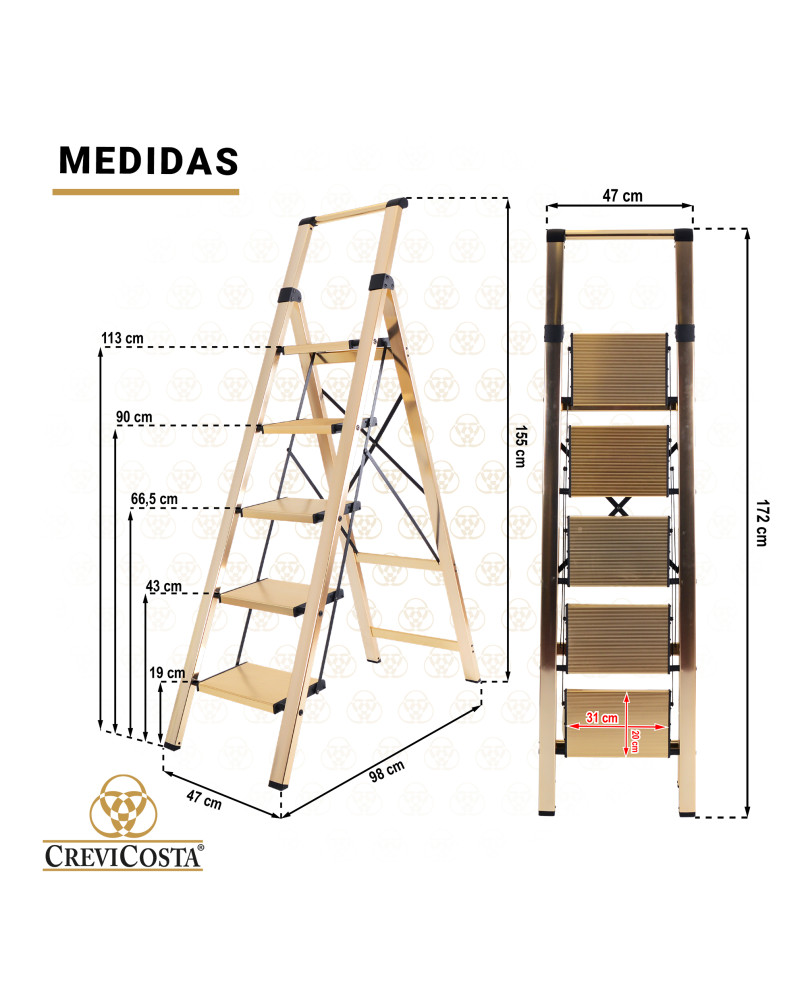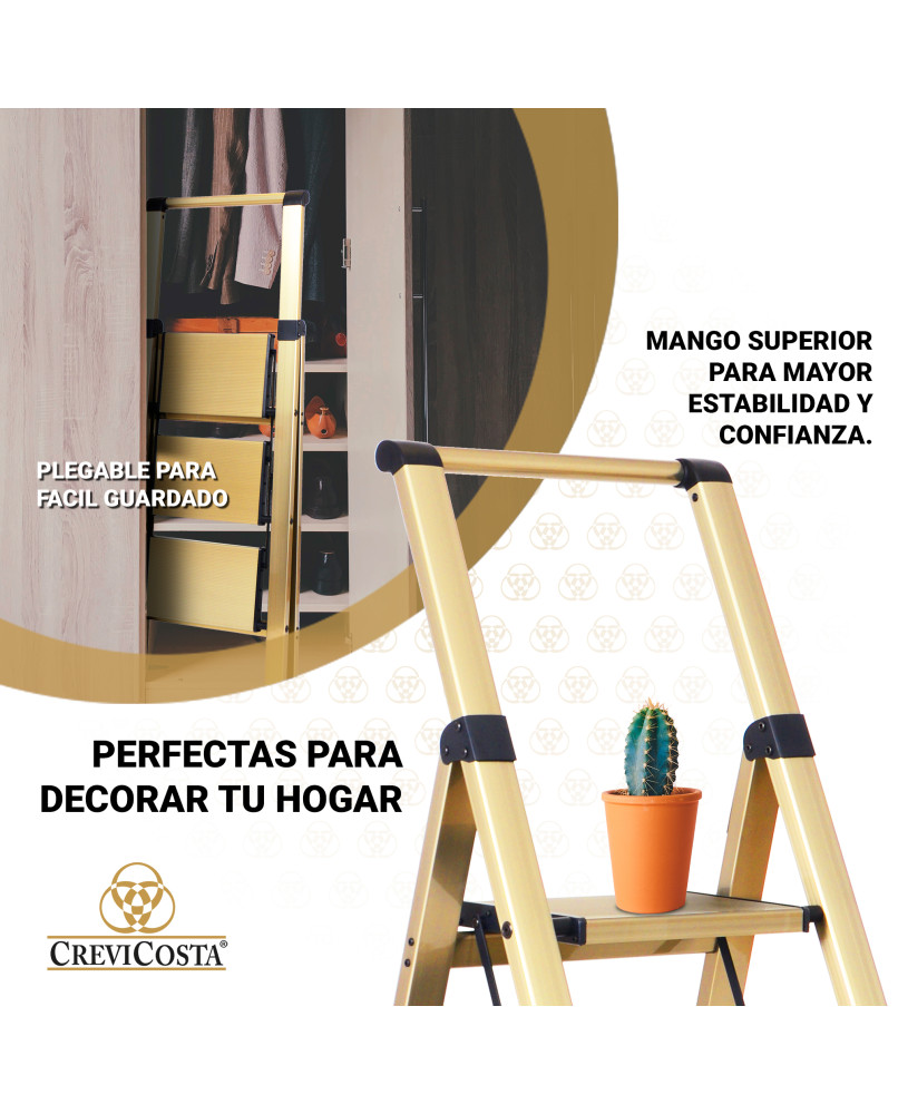 Escalera de Aluminio con Mango – 5 Peldaños Modelo ATENEA (oro). Seguridad, estabilidad y diseño para tu hogarLa escalera de aluminio con mango ATENEA de 5 peldaños es la solución perfecta para alcanzar esos lugares altos de forma segura y cómoda. Fabricada en aluminio resistente y ligero, combina funcionalidad con un diseño moderno en color oro, ideal para cualquier espacio del hogar. Tornillería y remaches de alta calidad. Cuenta con peldaños antideslizantes amplios y estables, y un mango superior ergonómico que proporciona un mejor agarre y equilibrio durante su uso. Compacta y plegable, se guarda fácilmente ocupando muy poco espacio. Características destacadas:5 peldaños anchos con superficie antideslizanteEstructura de aluminio ligera y duraderaMango superior para mayor seguridad y apoyoColor oro elegante y modernoPlegado compacto para fácil almacenamientoIdeal para tareas en el hogar, oficina o pequeños negociosPeso soportado: hasta 150 kg. Consejo de limpieza. Limpieza en seco. No utilizar productos abrasivos, de esta manera garantiza que no perderá el brillo inicial.