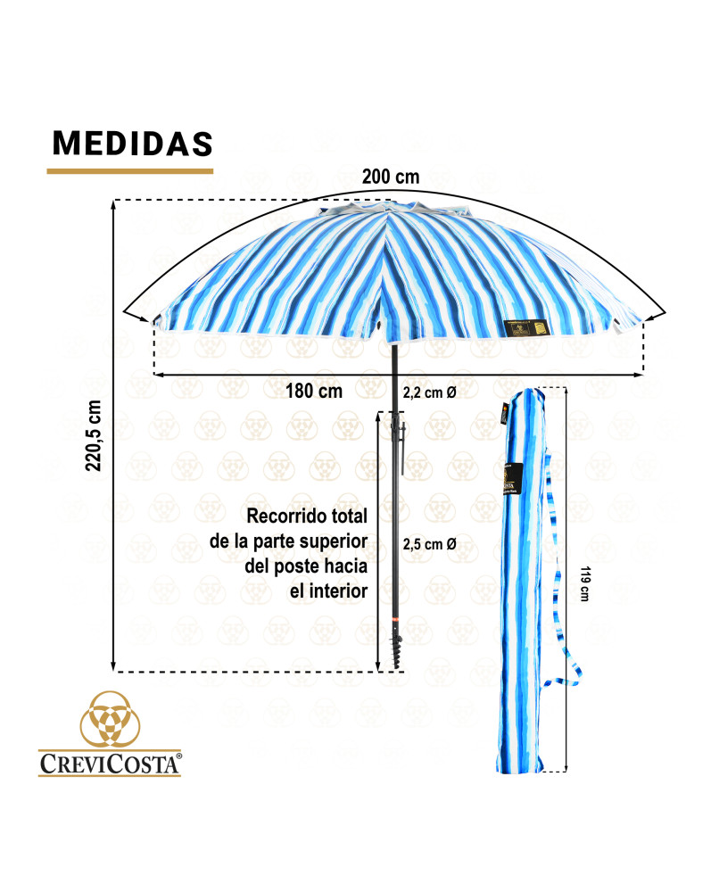 - Práctico, funcional y actualizado diseño del Poste que permite ajustar a la altura que se desee. Nuestros parasoles cuentan con sistema patentado de espiral para insertar en la arena de forma rápida, fácil y segura. El funcionamiento del poste puede comprobarlo en fotografía adjunta.