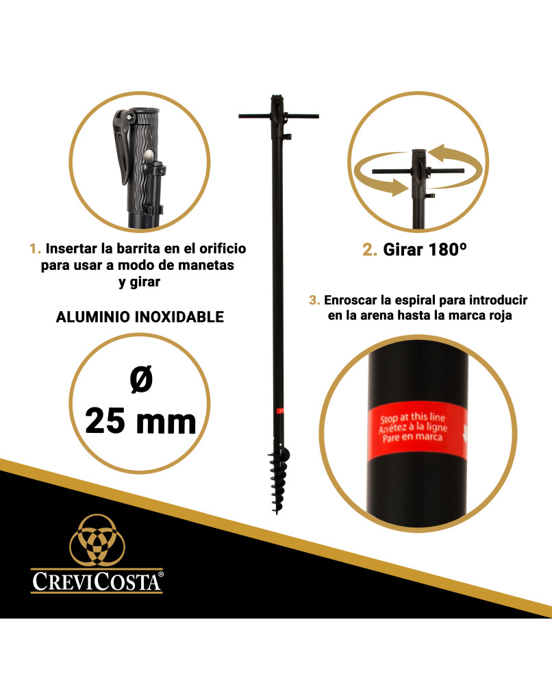 • Práctico, funcional y actualizado diseño del Poste que permite ajustar a la altura que se desee. Nuestros parasoles cuentan con sistema patentado de espiral para insertar en la arena de forma rápida, fácil y segura. El funcionamiento del poste puede comprobarlo en fotografía adjunta.