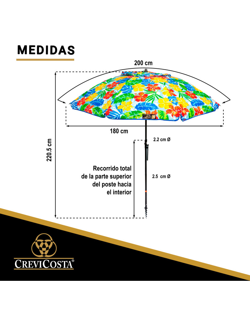 HAWAI 200 cm con Espiral y Poste de Recorrido Total. 8 Varillas. PROTECCIÓN Total contra los Rayos UV