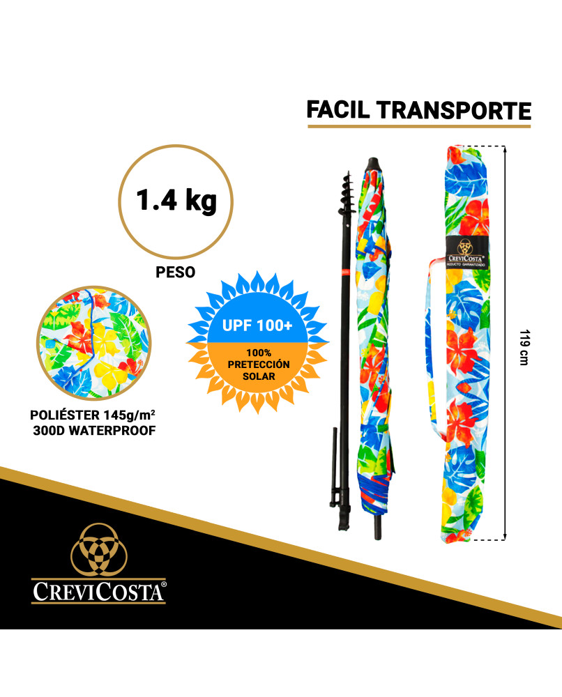 • Tejido poliéster 145g/m2 300D WATERPROOF, con recubrimiento de plata y tratamiento para soportar el sol, que aporta un tacto y aspecto elegantes a nuestros productos. PROTECCIÓN TOTAL especial UPF100+ contra los rayos UV, garantizando una protección completa frente a los rayos solares.