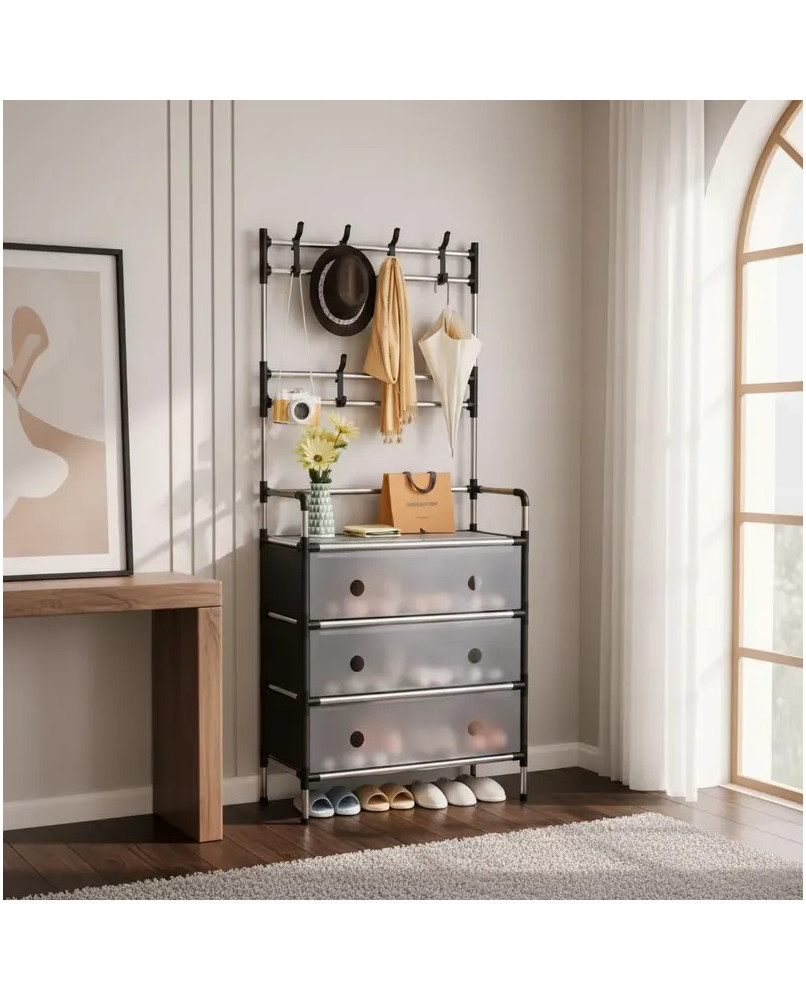 4. Área multifuncional para colgar: Es práctica, con una barra para colgar ropa en la parte superior, ideal para colgar abrigos, vestidos y otras prendas que no se doblan. La capa inferior abierta es ideal para colocar zapatos y cajas de almacenamiento, satisfaciendo así diferentes necesidades de almacenamiento.