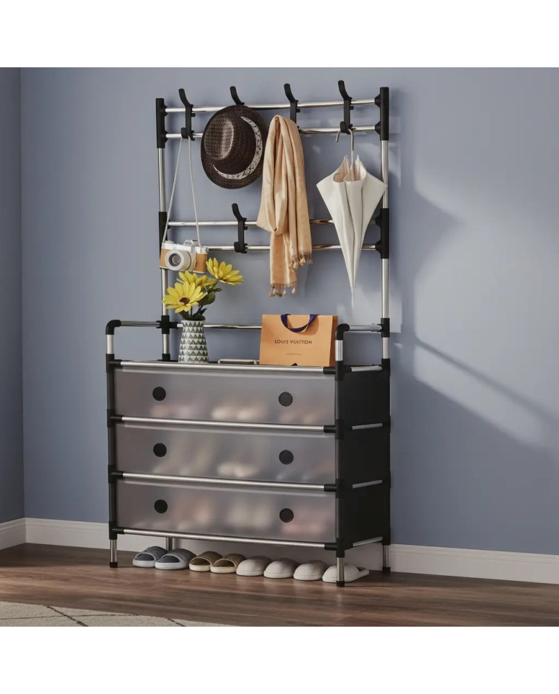 1. Gran capacidad de cuatro capas: Este perchero adopta un diseño ensanchado de cuatro capas, lo que proporciona un amplio espacio de almacenamiento, facilitando la clasificación y el almacenamiento de artículos del hogar como ropa, bolsos, zapatos, etc., para satisfacer las necesidades diarias de familias con varios miembros.