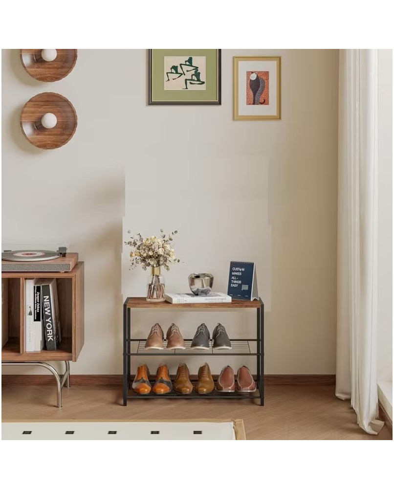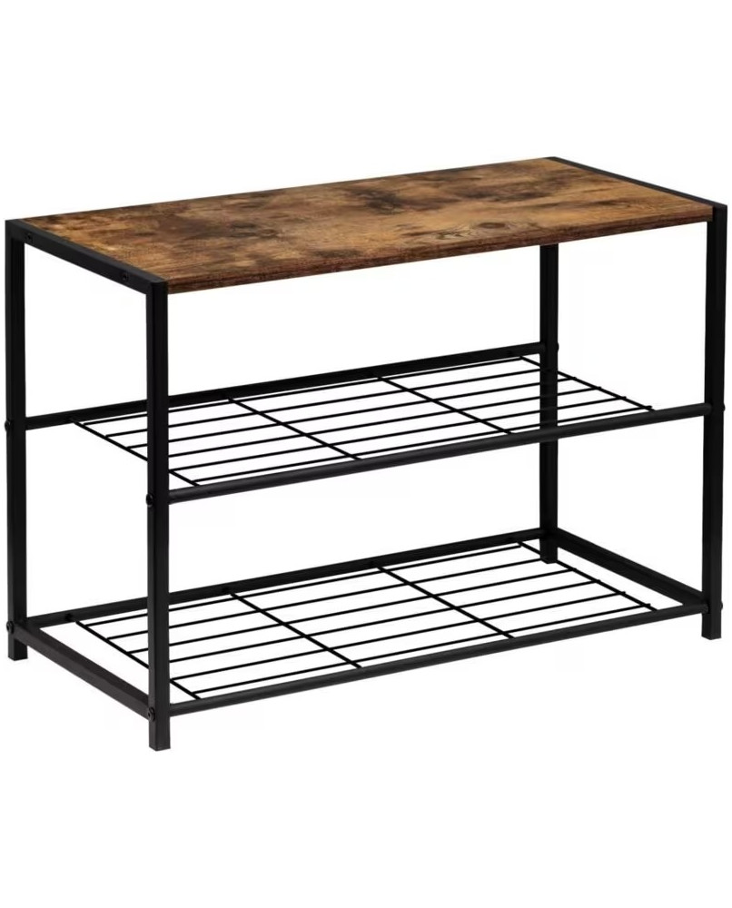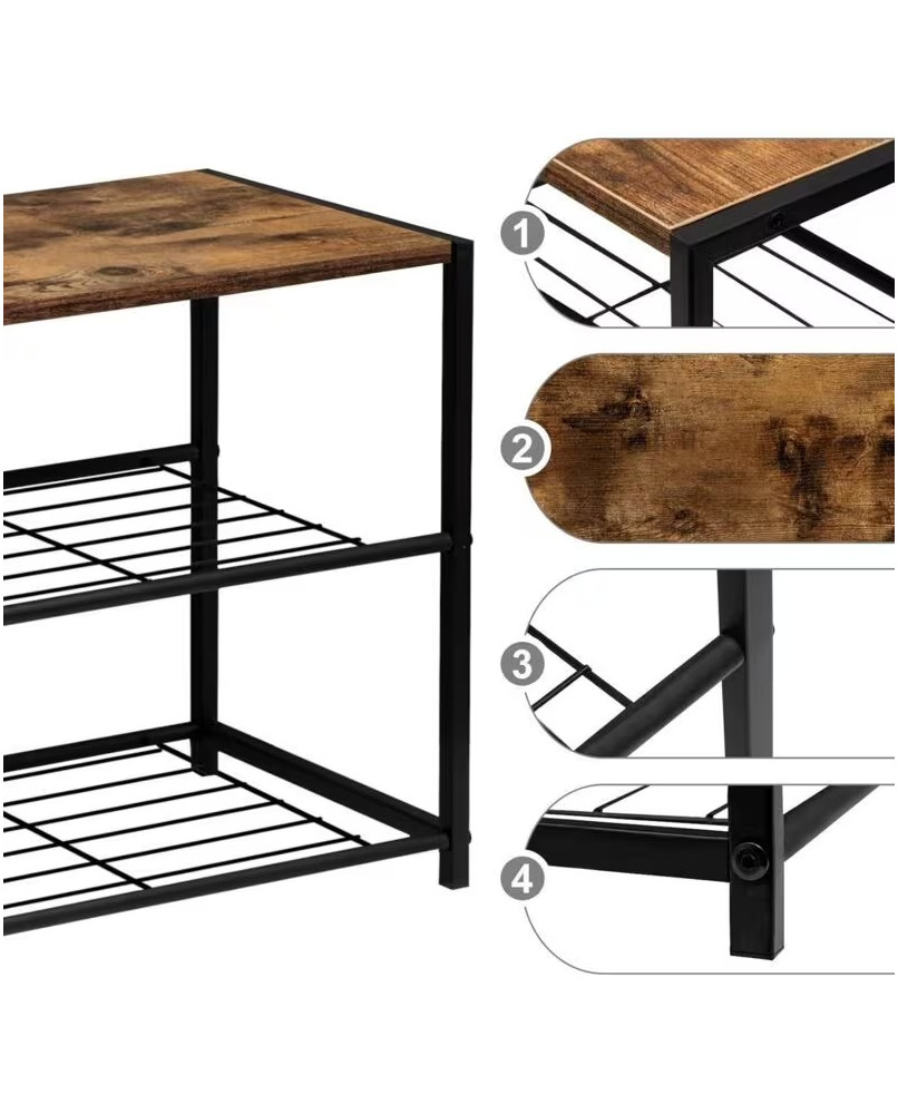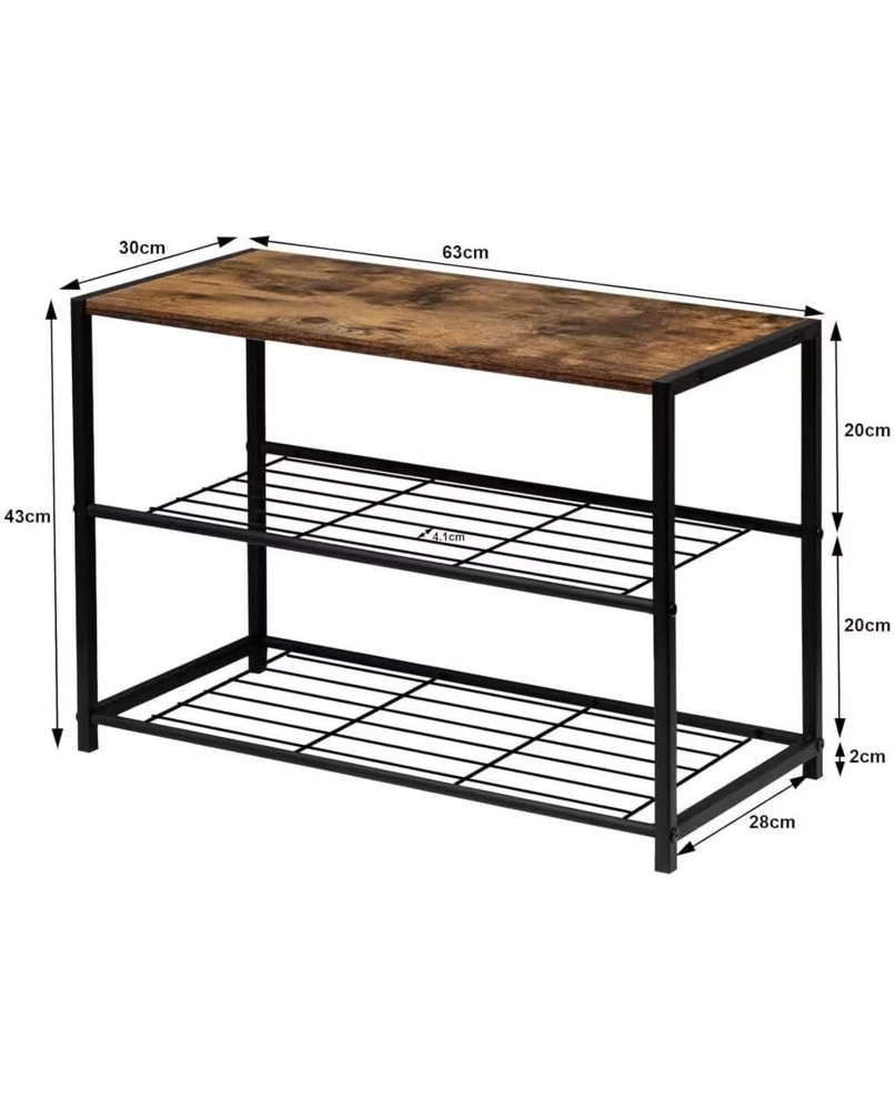 Este zapatero es ideal para organizar zapatos y otros artículos, ayudando a mantener el espacio libre de desorden. Puede colocarse en diferentes áreas del hogar, como la entrada, el dormitorio o el baño, proporcionando un lugar designado para cada objeto. Material: Tubos de acero y tablero de MDF (clase E1) Medidas: 63 x 30 x 43 cm Altura entre estantes: 19-20 cm Grosor del tablero: 1,5 cm Diámetro del tubo: 2 cm Carga máxima de la rejilla metálica: 5 kg/estante Carga máxima del tablero: 30 kg Peso neto: 3,42 kg; Peso bruto: 3,9 kg