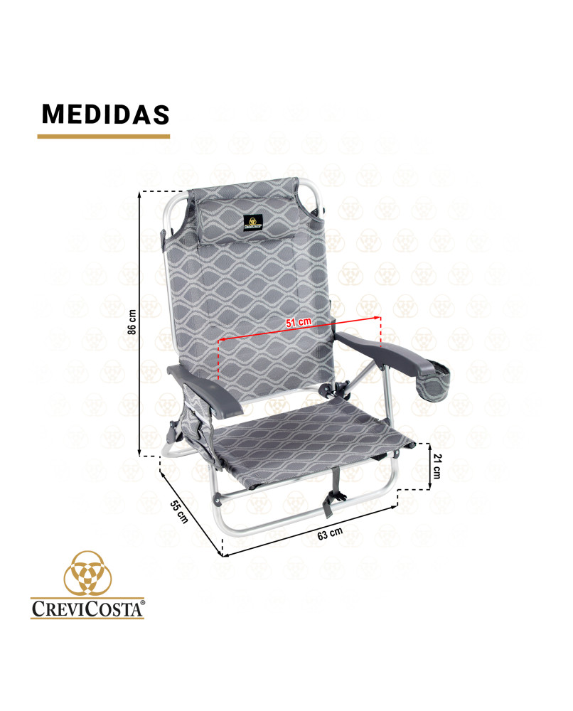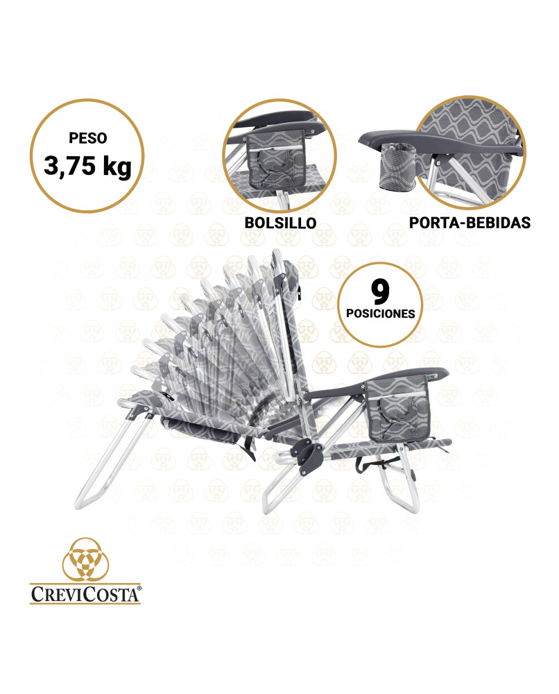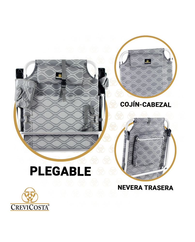 Silla de exterior y 9 posiciones. Cuenta con bolsillo lateral, porta-bebidas y nevera trasera para guardar tus objetos más necesarios. También cuenta con un cojín-cabezal ajustable en altura para sentarte cómodamente y tomar saludables baños de sol, aunque recomendamos que no sean muy largos y los combines descansando bajo una de nuestras sombrillas CREVICOSTA Protección total contra los rayos UV.