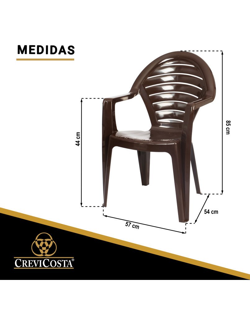 Estructura plástica de polipropileno. De estilo clásico y líneas modernas, es una silla práctica y funcional. Se puede apilar sin problemas.