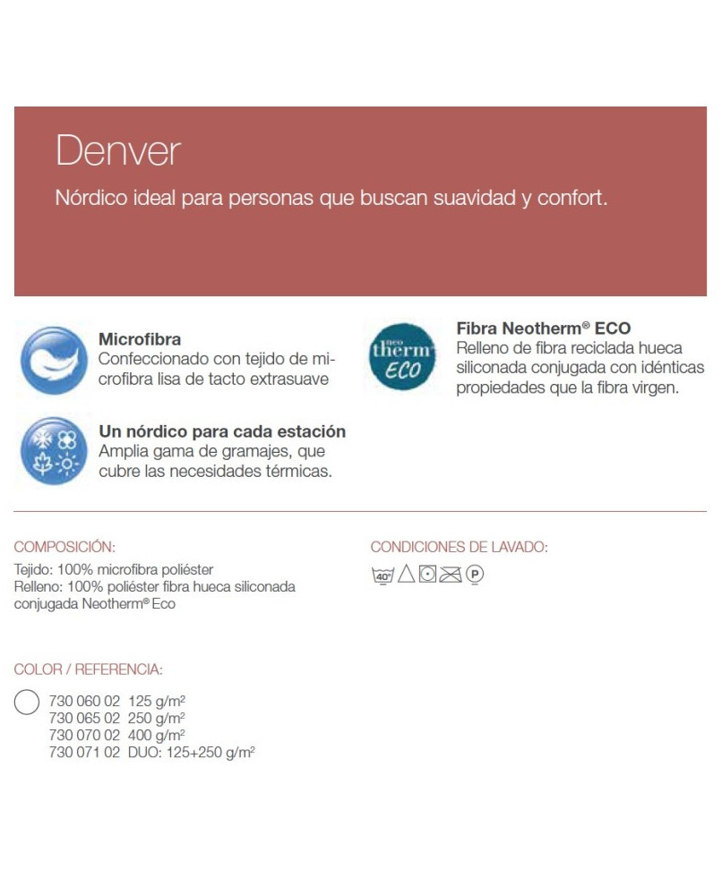 El edredón nórdico Denver de Velfont está confeccionado con tejido de microfibra lisa de tacto extrasuave. El relleno de este edredón nórdico es de fibra hueca siliconada conjugada Neotherm de primera calidad, que combina una excelente capacidad térmica y un elevado confort. Confeccionado con acanalado horizontal y ribete exterior en todo el perímetro. Tejido: 100% microfibra poliéster Relleno: 100% poliéster fibra hueca siliconada conjugada Neotherm