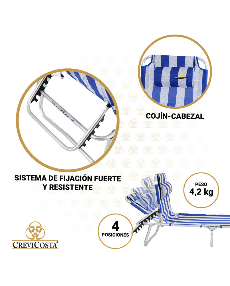 Tumbona plegable para exteriores. Respaldo abatible hasta 4 posiciones, además de la posición cama, totalmente tumbada. Cuenta con un cojín-cabezal, ajustable en altura para apoyar la cabeza y tomar saludables baños de sol, aunque recomendamos que no sean muy largos y los combines descansando bajo una de nuestras sombrillas CREVICOSTA Protección total contra los rayos UV.