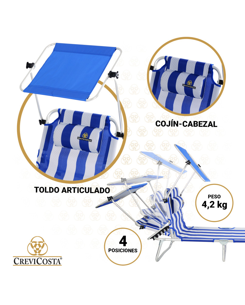 Tumbona plegable para exteriores. Respaldo abatible hasta 4 posiciones, además de la posición cama, totalmente tumbada. Cuenta con un cojín-cabezal, ajustable en altura para apoyar la cabeza y tomar saludables baños de sol. ¡SUPERNOVEDAD! Toldo ajustable incorporado y con UPF 100+, protección 100% contra los rayos UV. Protección total contra el cáncer de piel.
