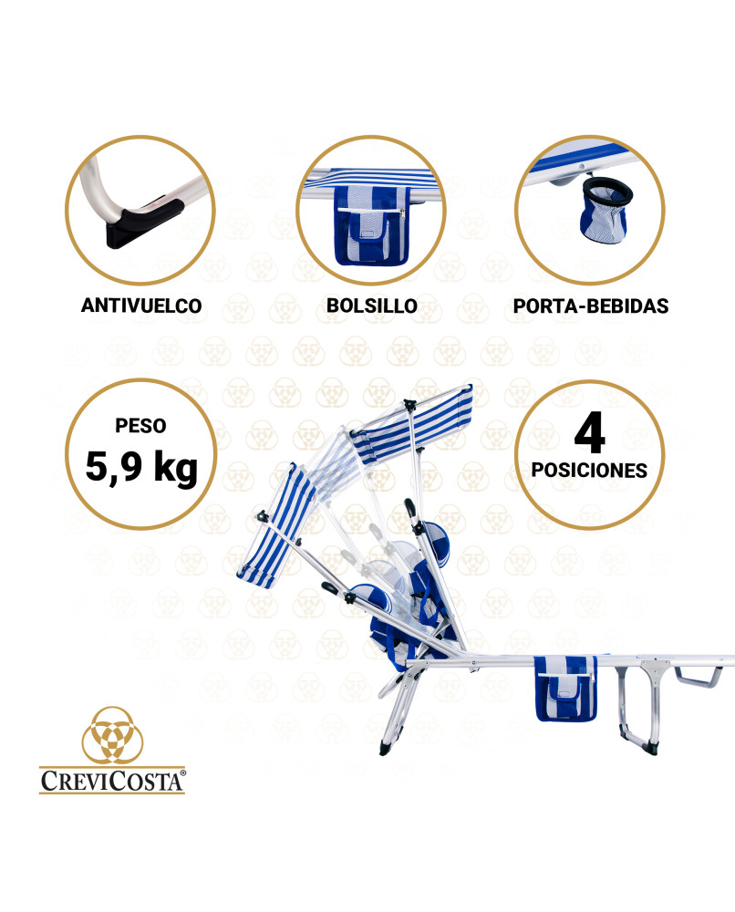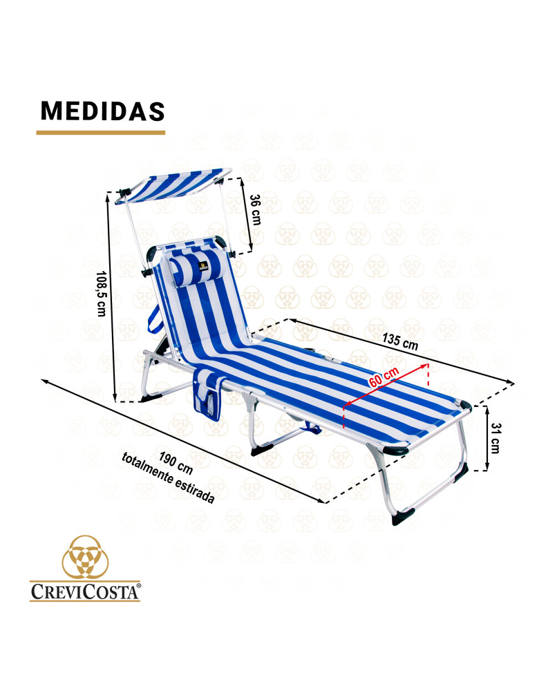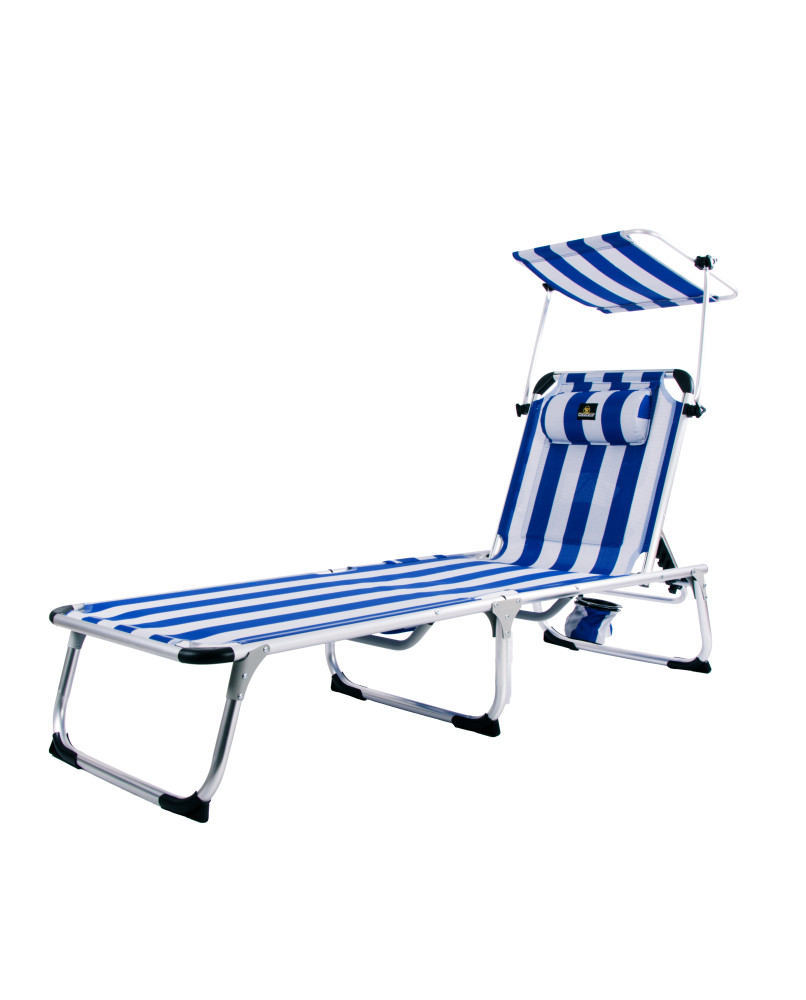 Tumbona plegable para exteriores. Respaldo abatible hasta 4 posiciones, además de la posición cama, totalmente tumbada. Cuenta con bolsillo lateral, porta-bebidas y mochila trasera para guardar tus objetos más necesarios. También cuenta con un cojín-cabezal, ajustable en altura para apoyar la cabeza, que queda protegida del sol gracias al toldo regulable que lleva incorporado.