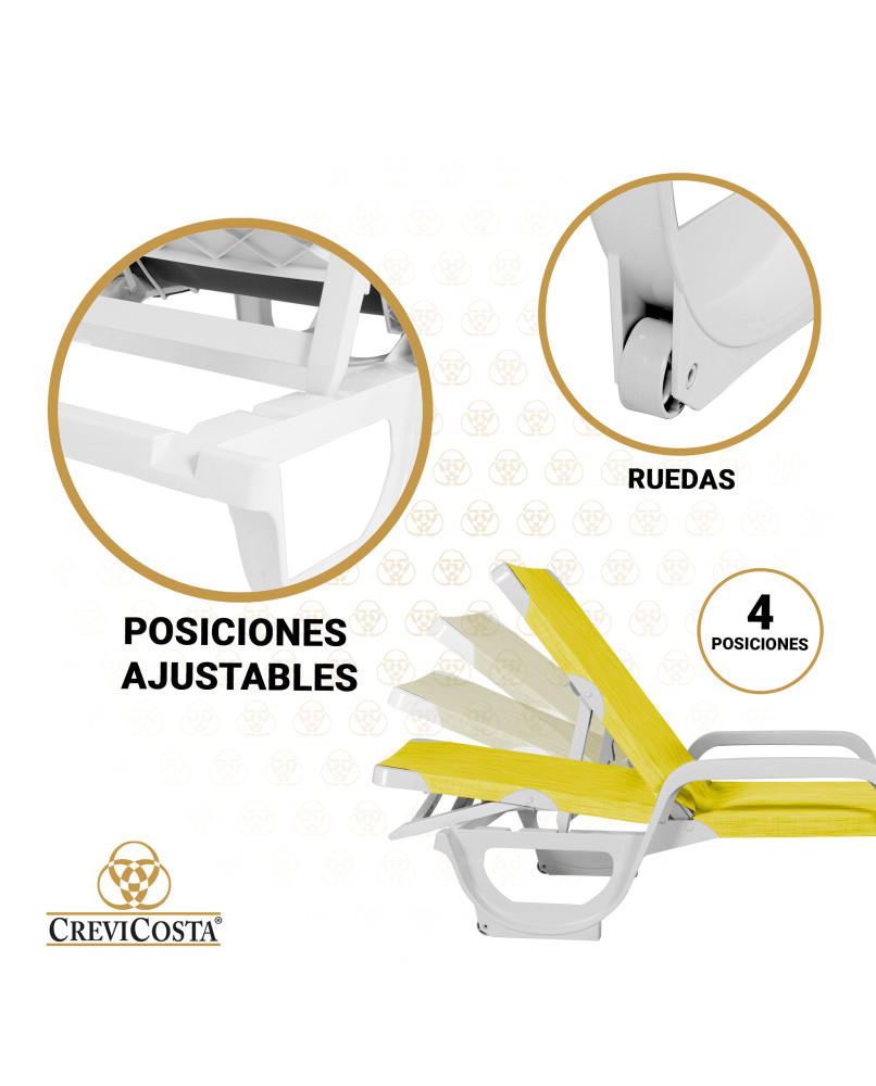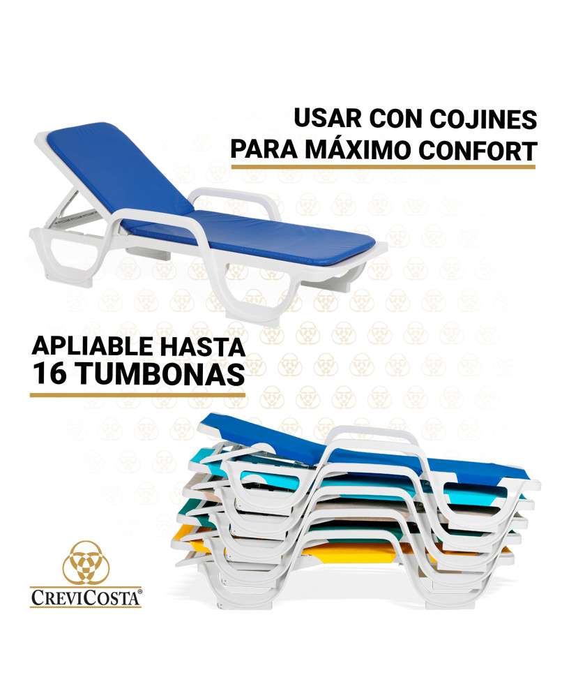 Tumbona de playa reclinable y abatible. Ideal para jardín, patio, piscina, terraza o balcón amplio. Mobiliario. Perfecta para tomar relajantes baños de sol en verano, aunque recomendamos que no sean muy largos y los combines descansando bajo una de nuestras sombrillas CREVICOSTA Protección total contra los rayos UV.