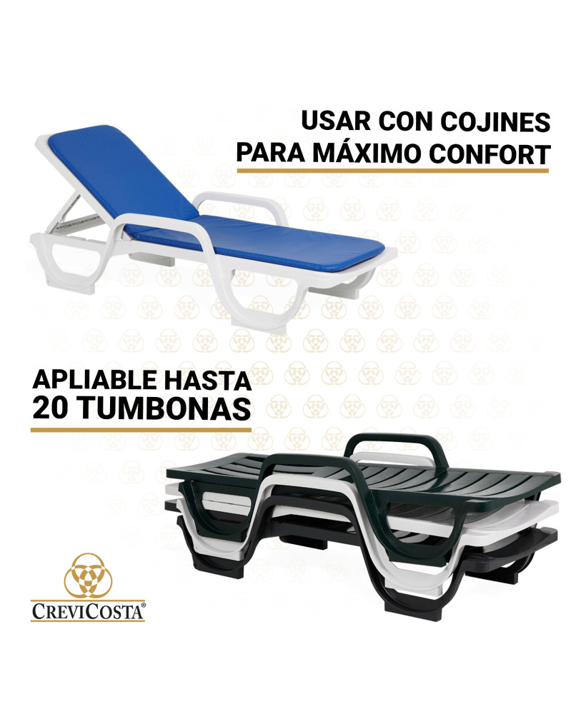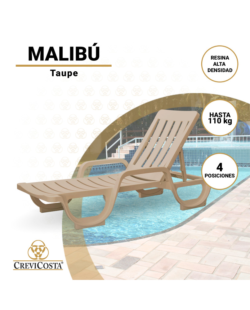 Tumbona de jardín y piscina reclinable y abatible modelo Malibú. Ideal para quienes buscan comodidad y versatilidad en su mobiliario de verano. Diseñada con una estructura de una sola pieza y reposabrazos incorporado, esta tumbona es perfecta para disfrutar de relajantes baños de sol. Sin embargo, recomendamos combinar los momentos de sol con descansos bajo una de nuestras sombrillas CREVICOSTA, que ofrecen protección total contra los rayos UV. Fabricada en polipropileno de alta densidad, la tumbona Malibú cuenta con protección contra los rayos UV, asegurando su durabilidad y resistencia al uso prolongado al aire libre. 4 posiciones ajustables que permiten personalizar la experiencia de descanso, incluso pudiendo usarse como cama para camping. Es adecuada tanto para uso interior como exterior, lo que la convierte en una excelente opción para hoteles, piscinas y playas. Gracias a sus ruedas traseras, esta tumbona es fácil de recoger, transportar y mover, ofreciendo gran versatilidad para disfrutarla en el jardín, patio, piscina, terraza o balcón amplio. Además, es apilable hasta 20 unidades, facilitando su almacenamiento. Cada tumbona pesa 8,60 kg y soporta hasta 110 kg. El mantenimiento y la limpieza de la tumbona Malibú son sencillos: basta con aplicar un trapo húmedo con agua y jabón neutro. Es importante no usar productos abrasivos para garantizar que la tumbona mantenga su brillo y calidad.