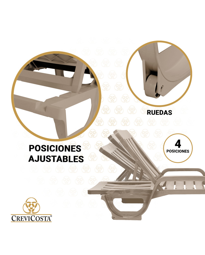 OFERTA. Lote de 2 Tumbonas de Resina MALIBÚ + Mesita SOLID Blanca de regaloTumbona de jardín y piscina reclinable y abatible modelo Malibú. Ideal para quienes buscan comodidad y versatilidad en su mobiliario de verano. Diseñada con una estructura de una sola pieza y reposabrazos incorporado, esta tumbona es perfecta para disfrutar de relajantes baños de sol. Sin embargo, recomendamos combinar los momentos de sol con descansos bajo una de nuestras sombrillas CREVICOSTA, que ofrecen protección total contra los rayos UV. Fabricada en polipropileno de alta densidad, la tumbona Malibú cuenta con protección contra los rayos UV, asegurando su durabilidad y resistencia al uso prolongado al aire libre. 4 posiciones ajustables que permiten personalizar la experiencia de descanso, incluso pudiendo usarse como cama para camping. Es adecuada tanto para uso interior como exterior, lo que la convierte en una excelente opción para hoteles, piscinas y playas. Gracias a sus ruedas traseras, esta tumbona es fácil de recoger, transportar y mover, ofreciendo gran versatilidad para disfrutarla en el jardín, patio, piscina, terraza o balcón amplio. Además, es apilable hasta 20 unidades, facilitando su almacenamiento. Cada tumbona pesa 8,60 kg y soporta hasta 110 kg. El mantenimiento y la limpieza de la tumbona Malibú son sencillos: basta con aplicar un trapo húmedo con agua y jabón neutro. Es importante no usar productos abrasivos para garantizar que la tumbona mantenga su brillo y calidad.